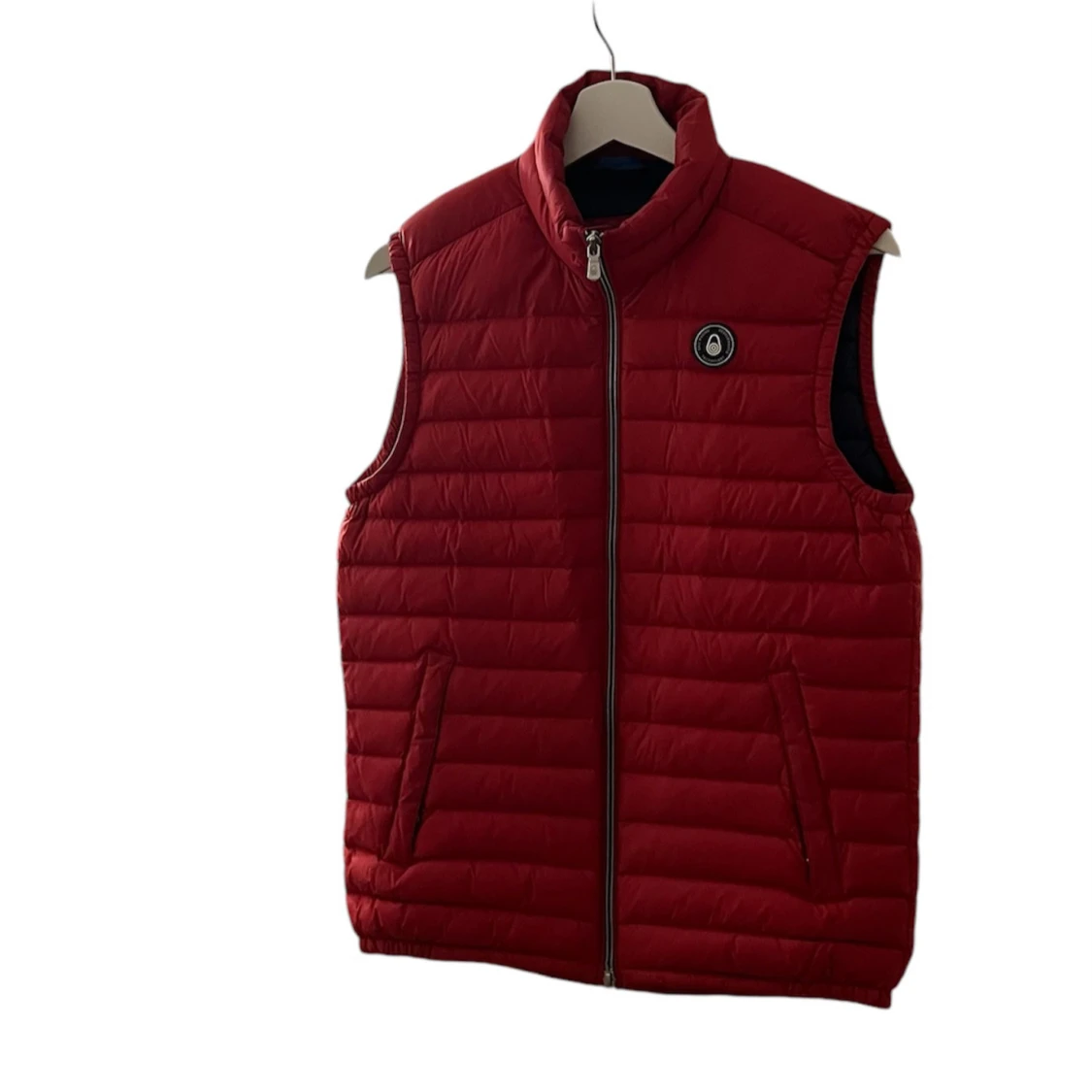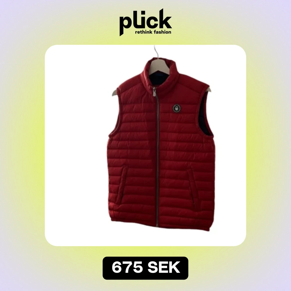 Säljer en snygg röd quiltad dunväst med dragkedja framtill. Västen har en hög krage och två fickor på sidorna. Perfekt för kyliga höst- och vårdagar. Den är i nyskick och passar bra för både vardag och friluftsliv.