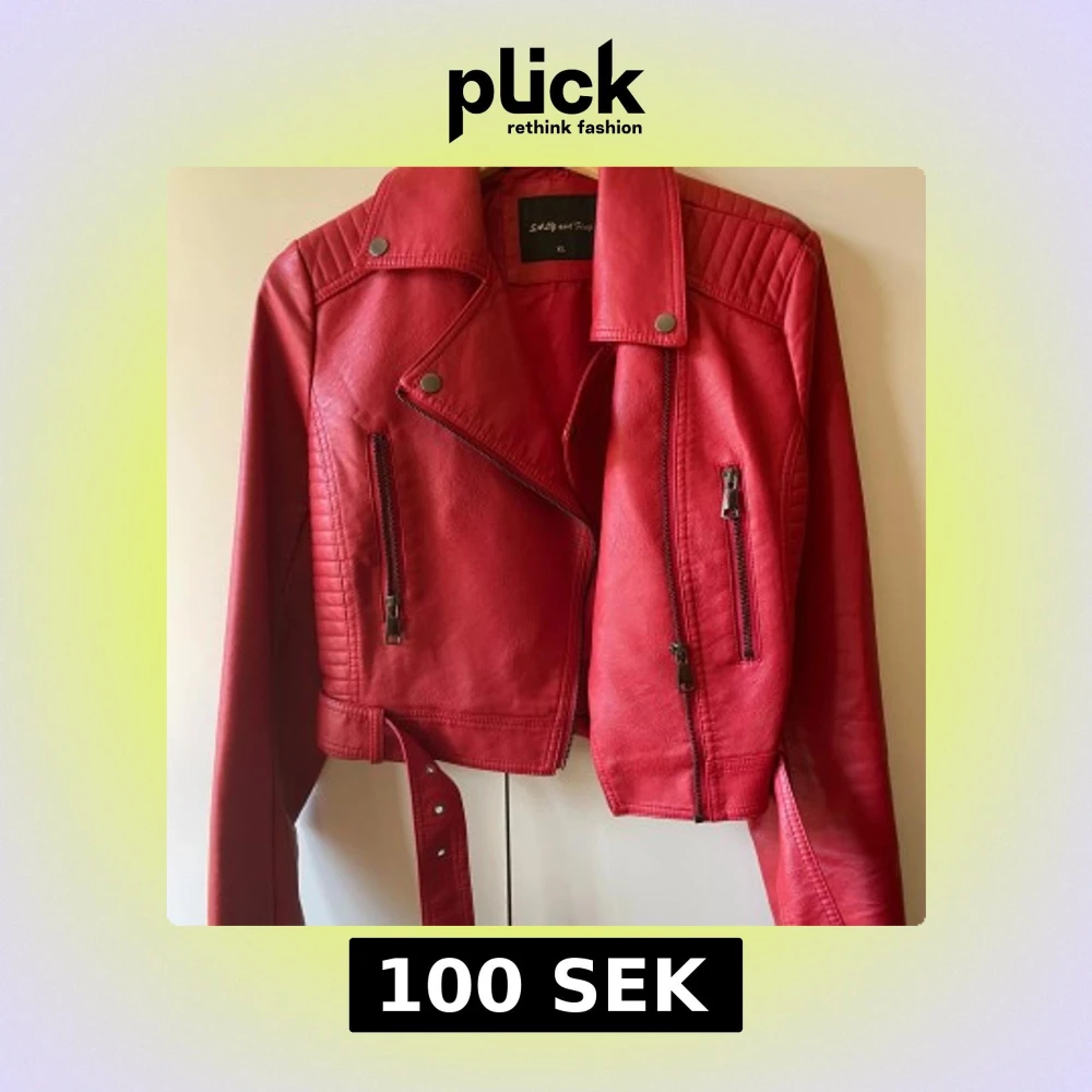Snygg röd skinnjacka från Sally and Dog i storlek XL men är mindre i storlek och passar till folk som bär M i storlek. Jackan har en cool bikerstil med dragkedjor och ett bälte i midjan. Perfekt för att ge din outfit en edgy touch. 🖤