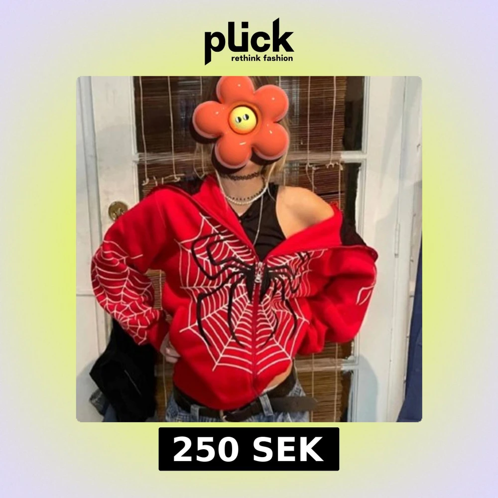 Säljer en röd jacka med svart och vitt spindelnätsmönster och stor spindel på bröstet. Jackan har dragkedja framtill och lång ärm. Perfekt för dig som vill sticka ut med en cool streetstyle.