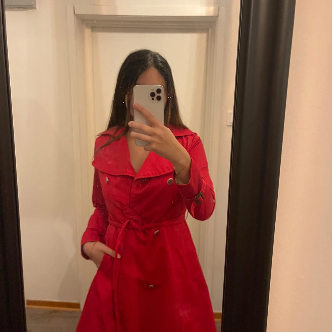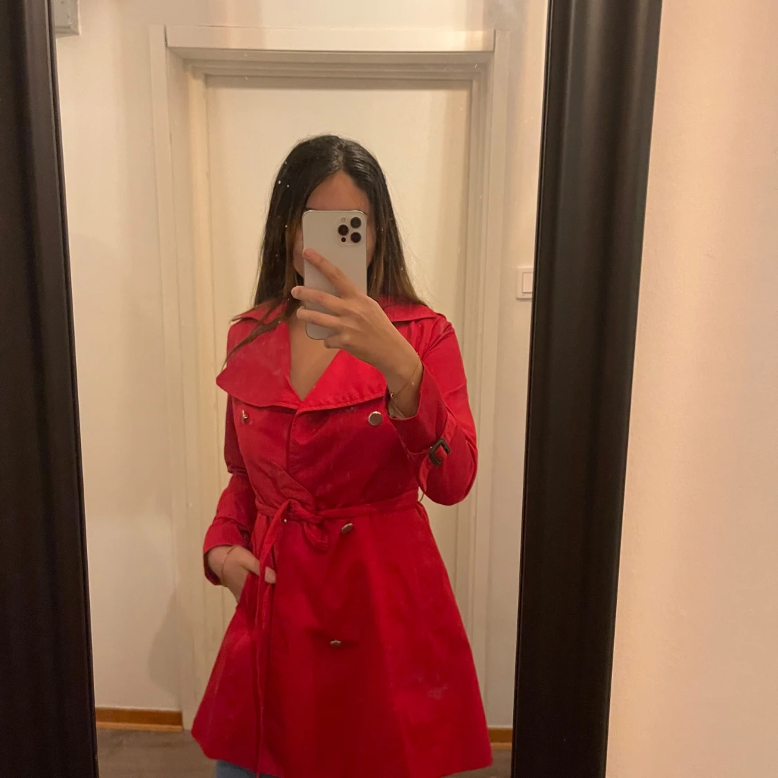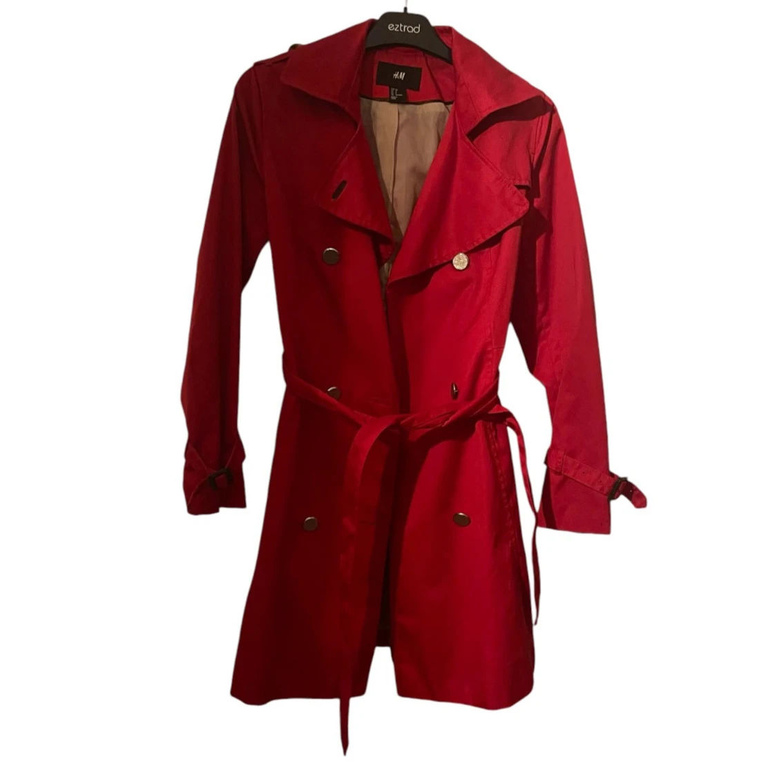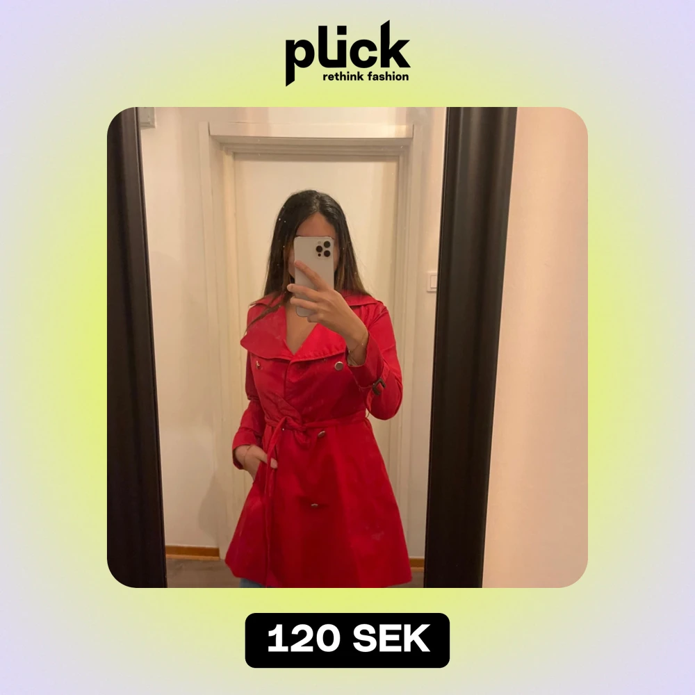 Säljer en snygg röd trenchcoat från H&M i storlek XS. Jackan har långa ärmar och ett bälte i midjan för en stilren look. Perfekt för höst och vår! 🧥