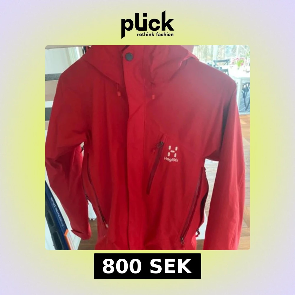 Säljer en röd vindjacka från Haglöfs med dragkedja och huva. Jackan har långa ärmar och flera praktiska fickor med dragkedjor. Perfekt för utomhusaktiviteter och skyddar mot vind och regn.