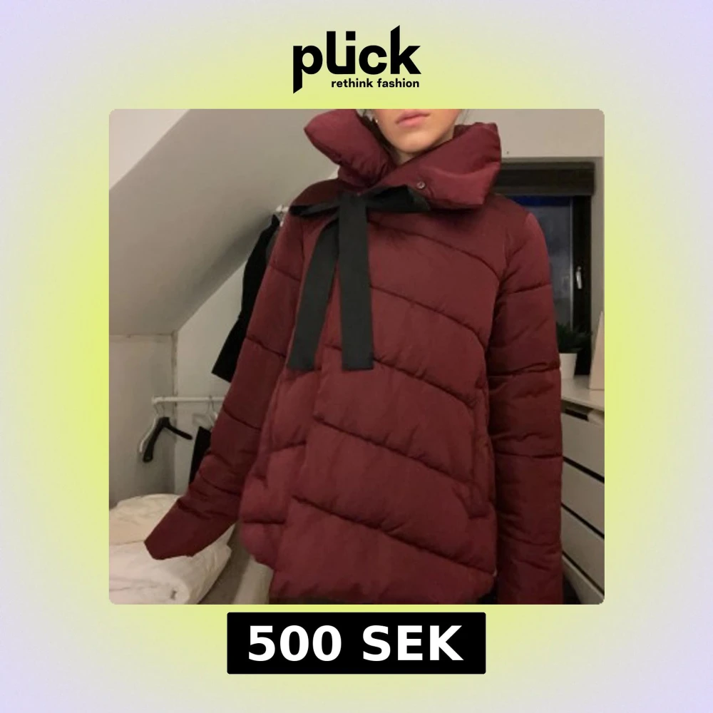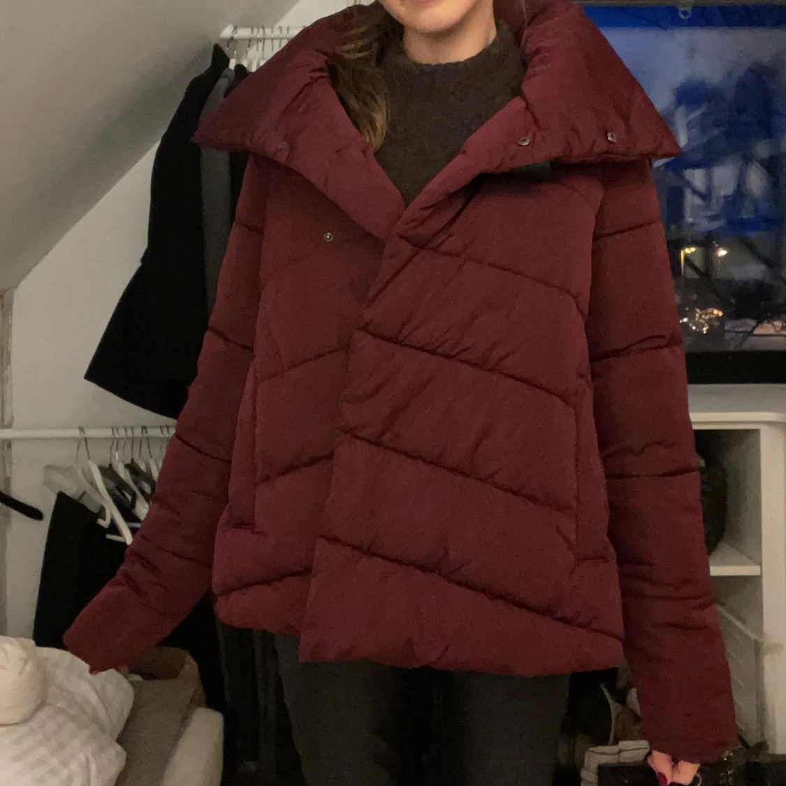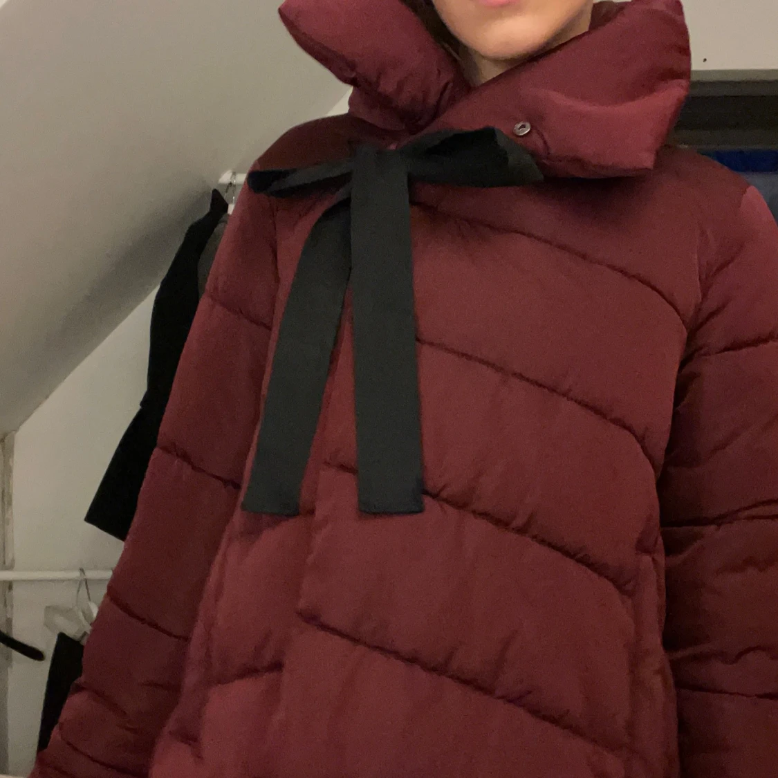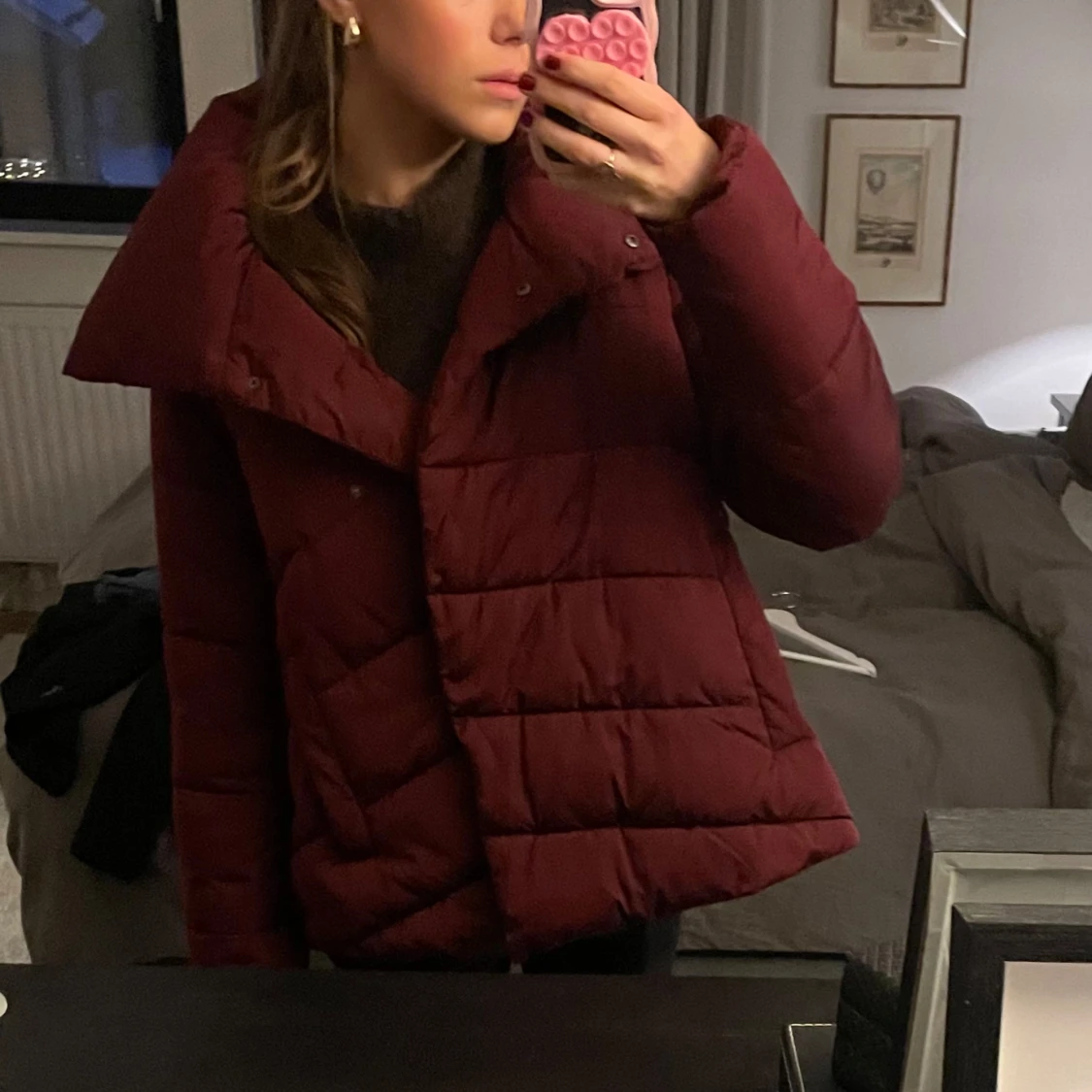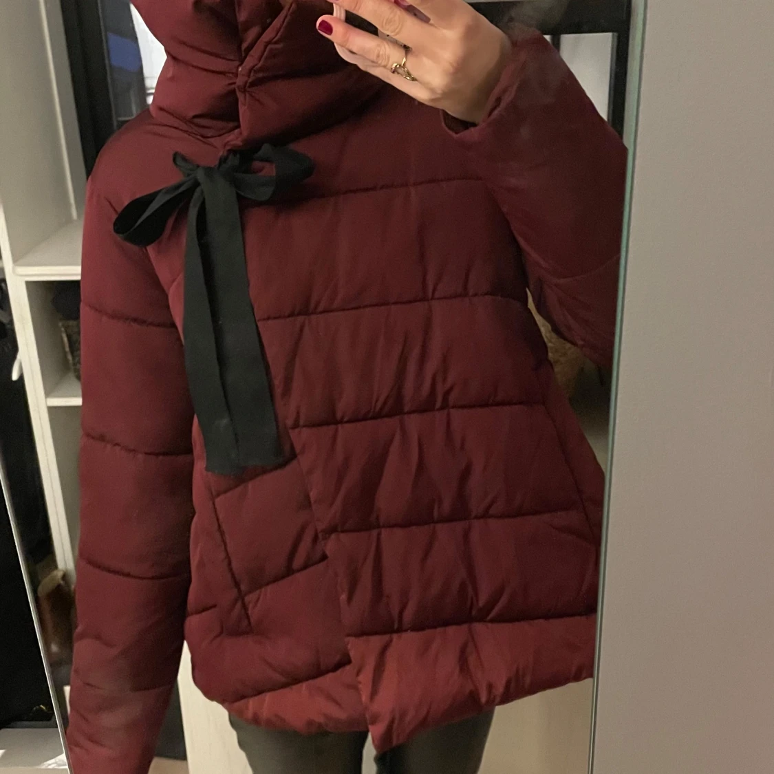 Quiltad vinröd jacka, har ett band som går att knyta till en rosett om man vill