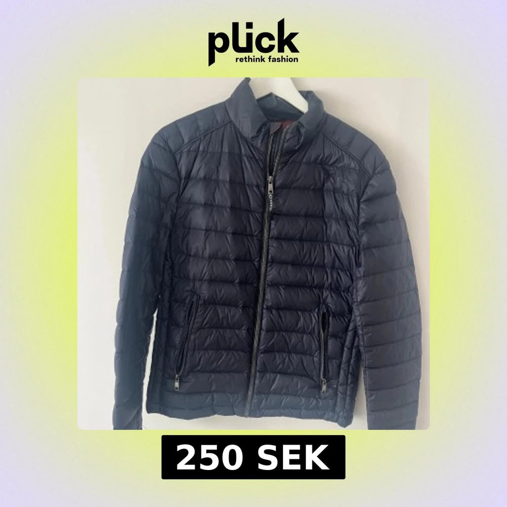 Snygg svart dunjacka med quiltad design och röd insida. Jackan har dragkedja framtill, två fickor med dragkedja och hög krage. Perfekt för kyliga dagar och ger en clean look till din outfit. Inga skador på jackan.