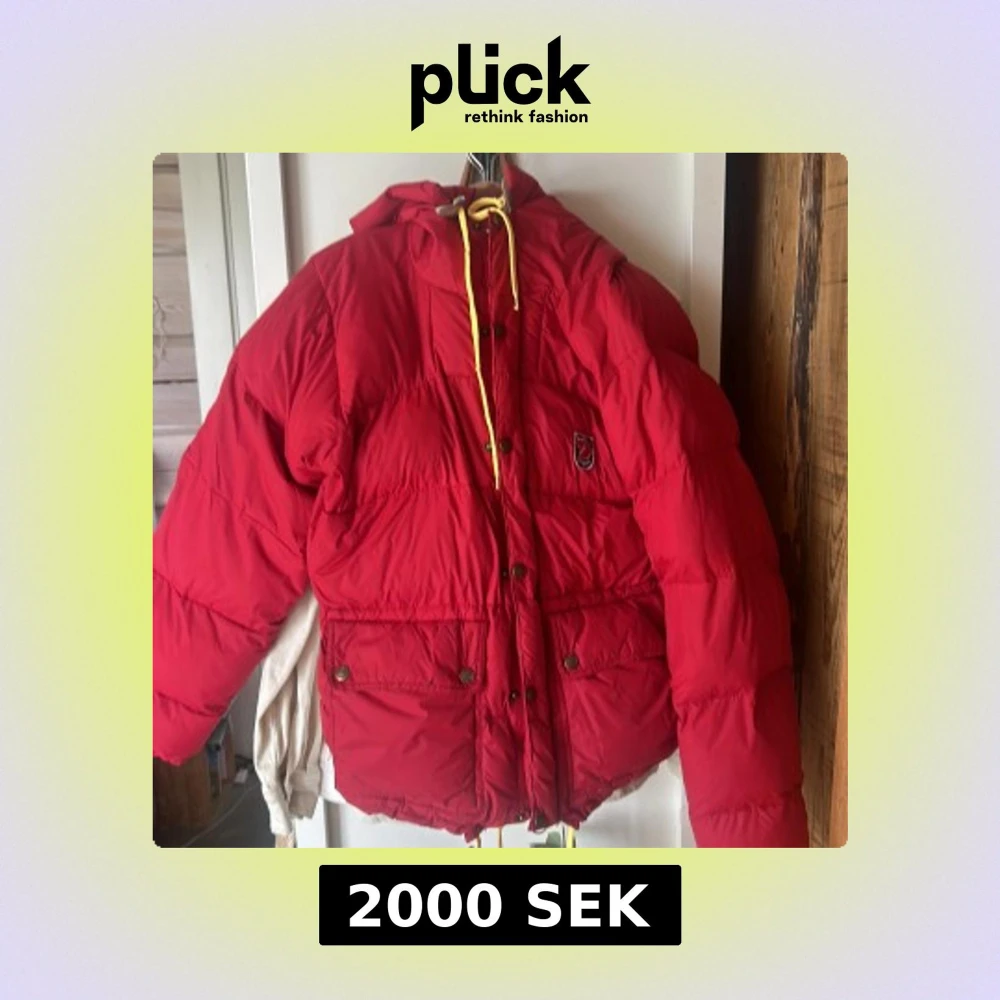 Röd Fjällräven med huva och gula snören. stora fickor och huva. Storleken är en herr xs och sitter som en dam. Dock finns en fläck , se sista bilden.