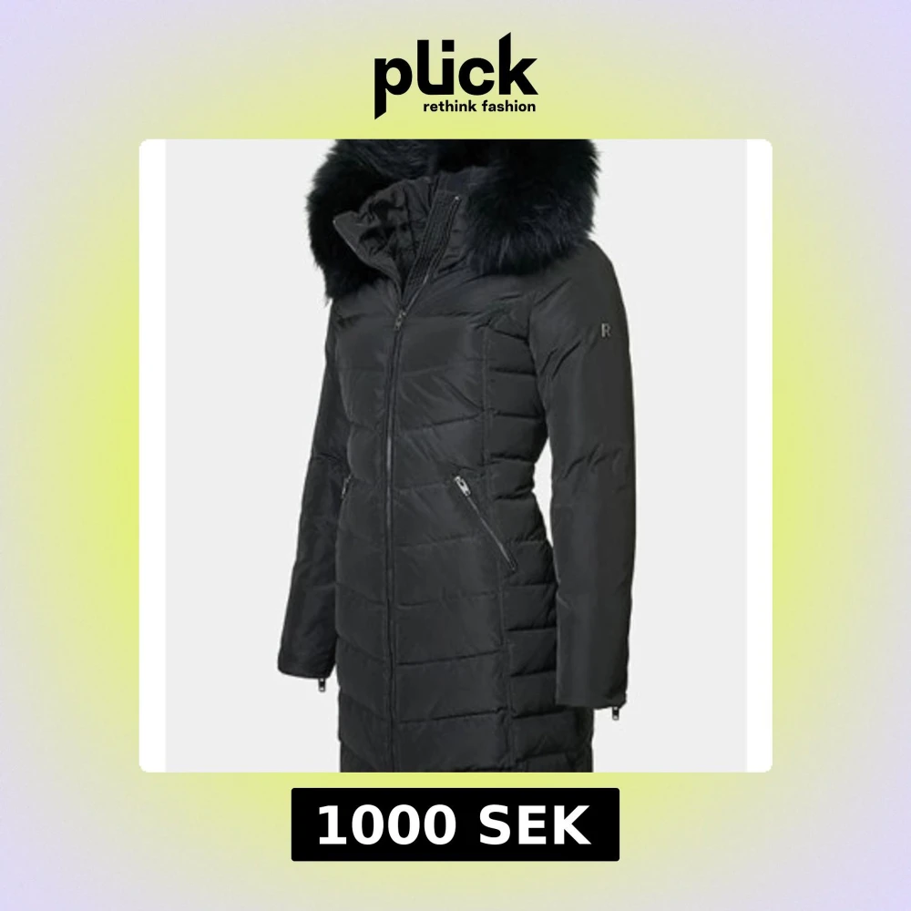 Snygg svart lång dunjacka från Röhnisch med fluffig fuskpäls runt huvan. Jackan har quiltad design, dragkedja framtill och två snedställda fickor med dragkedja. Perfekt för kalla dagar när du vill hålla stilen.