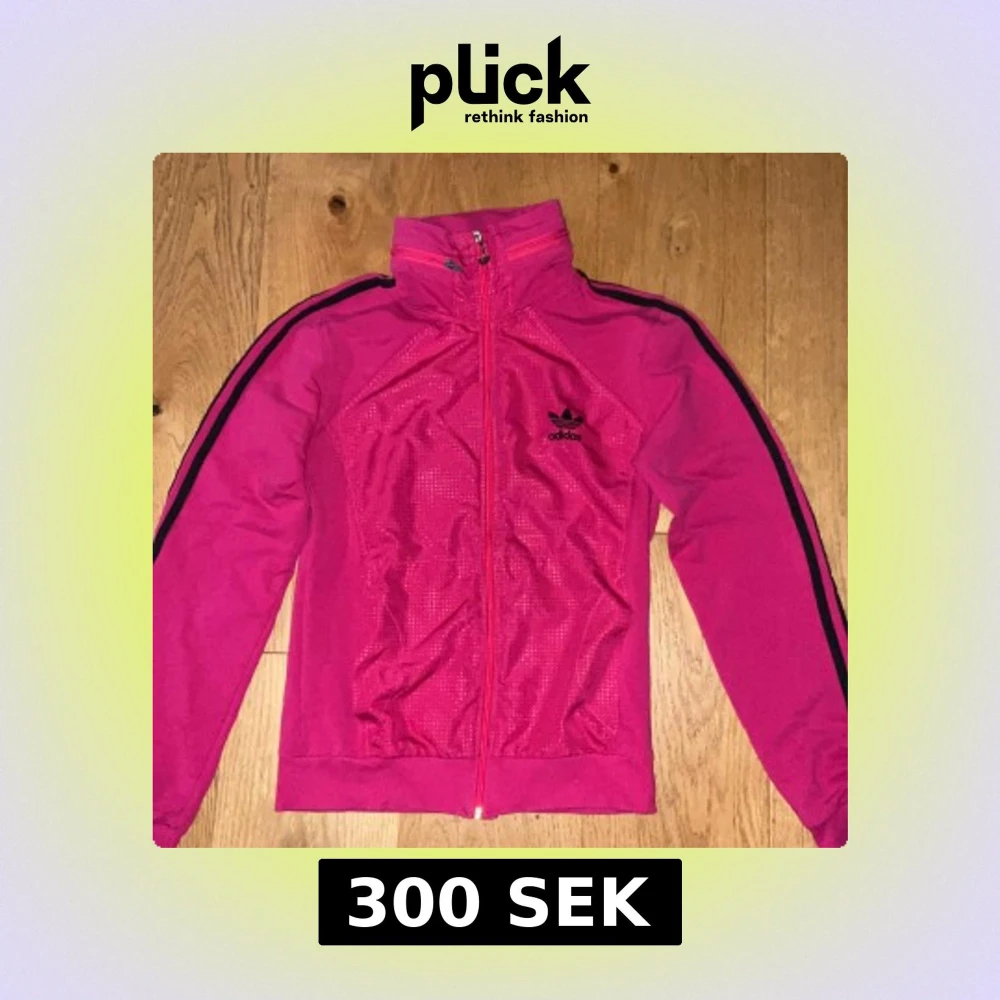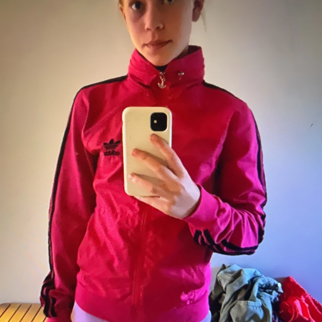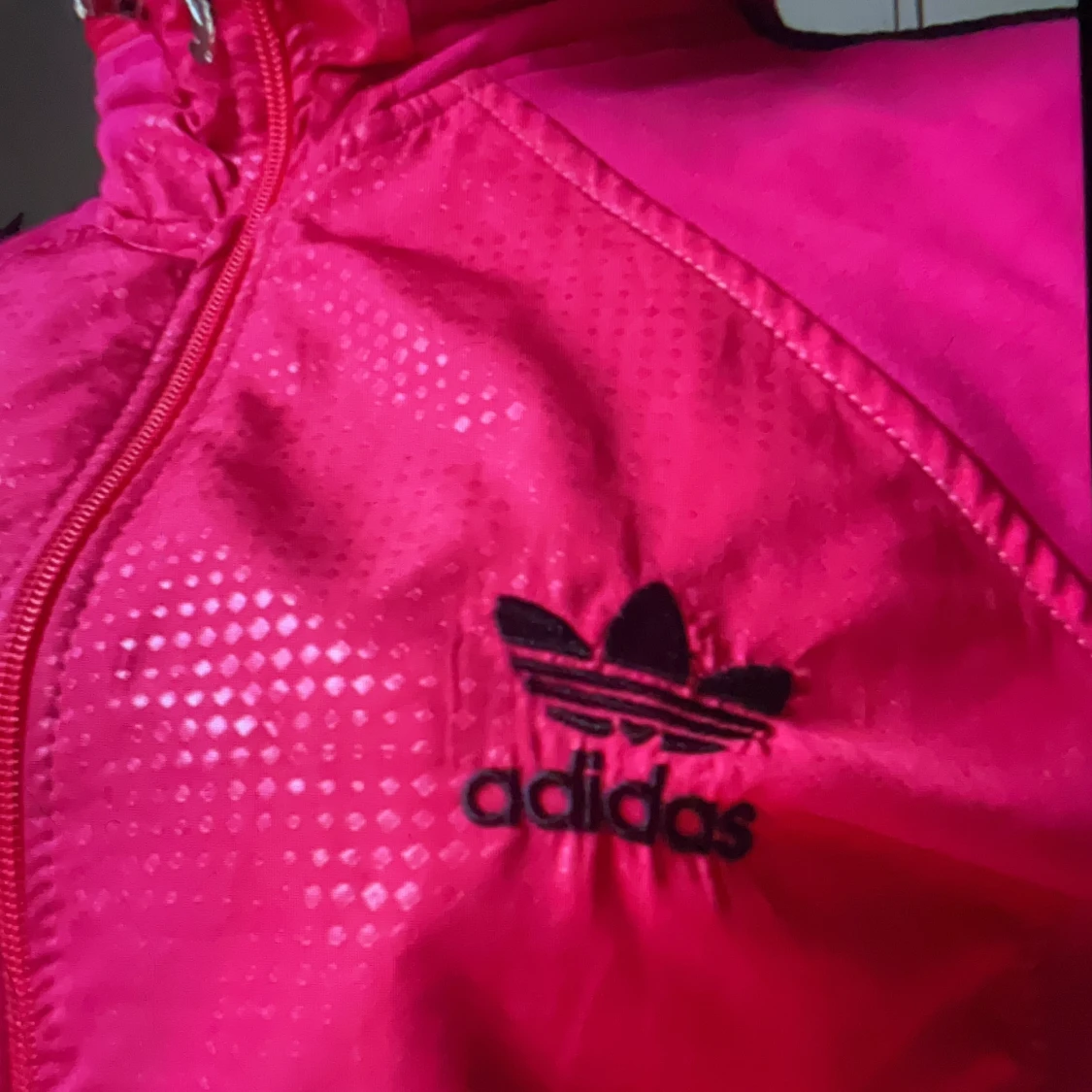 Säljer en snygg rosa Adidas vindjacka med svarta ränder längs ärmarna och broderad logga på bröstet. Jackan har hel dragkedja, hög krage och diskret mönster framtill. Perfekt för dig som gillar sportig stil och vill sticka ut. Retro tröja!😃