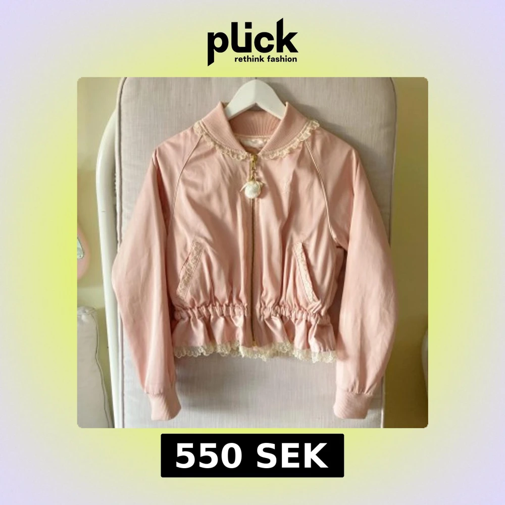 Supersöt ljusrosa bomberjacka från Liz Lisa med spetsdetaljer, broderad text och hjärtan på ryggen. Jackan har dragkedja med fluffig vit boll, snörning med rosetter bak och volangkant nertill 🎀 Uppskattad storlek XS/S