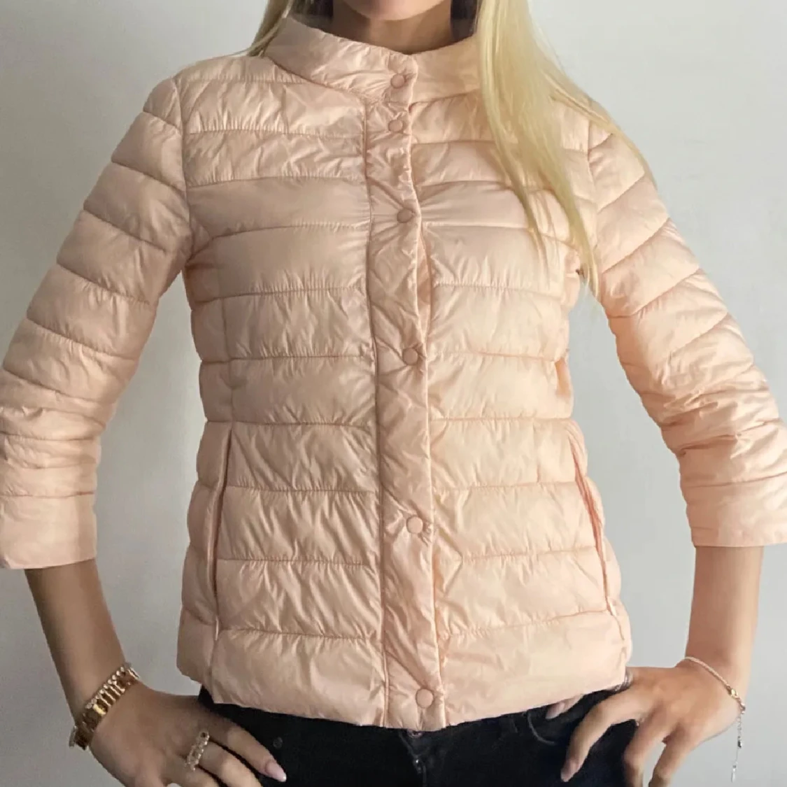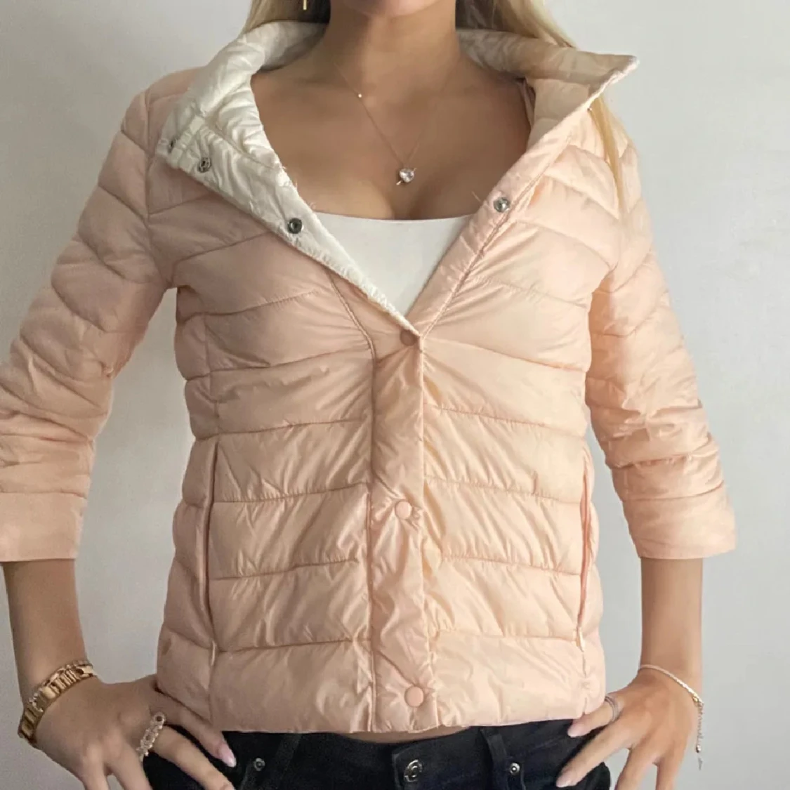 FÖLJ FÖR LIKNANDE🩷 jätte fin aprikos/rosa Herno liknande jacka som är perfekt för höst och vinter. Storlek M men passar en S. Inga defekter! Tryck köp nu! TK-0069