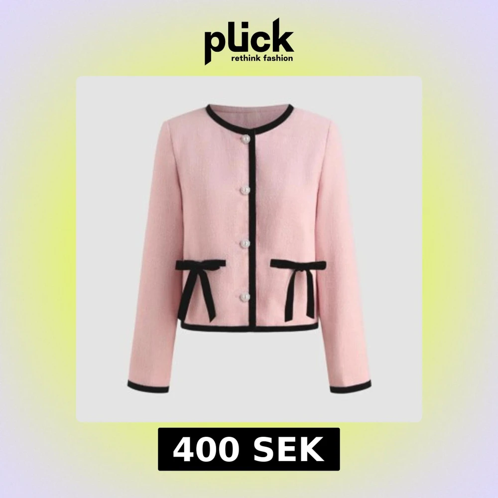 Snygg rosa kavaj från Cider med svarta detaljer och knappar framtill. Den har dekorativa rosetter vid fickorna och en elegant rund halsringning. Perfekt för en stilren look.