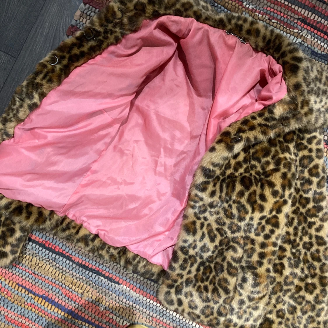 Leopardpäls med rosa foder, även rosa foder under kragen. Väldigt fint skick. Strl. XS.