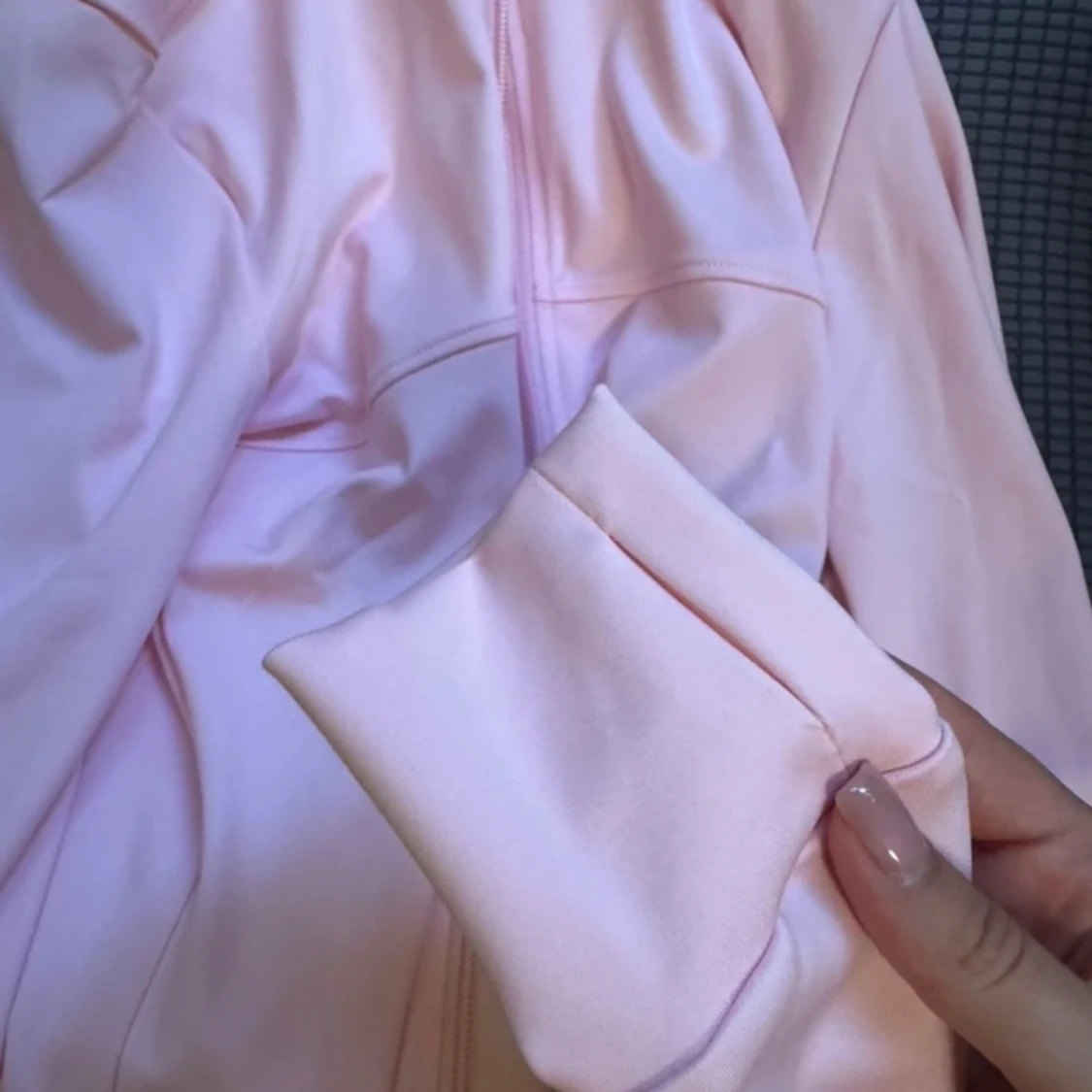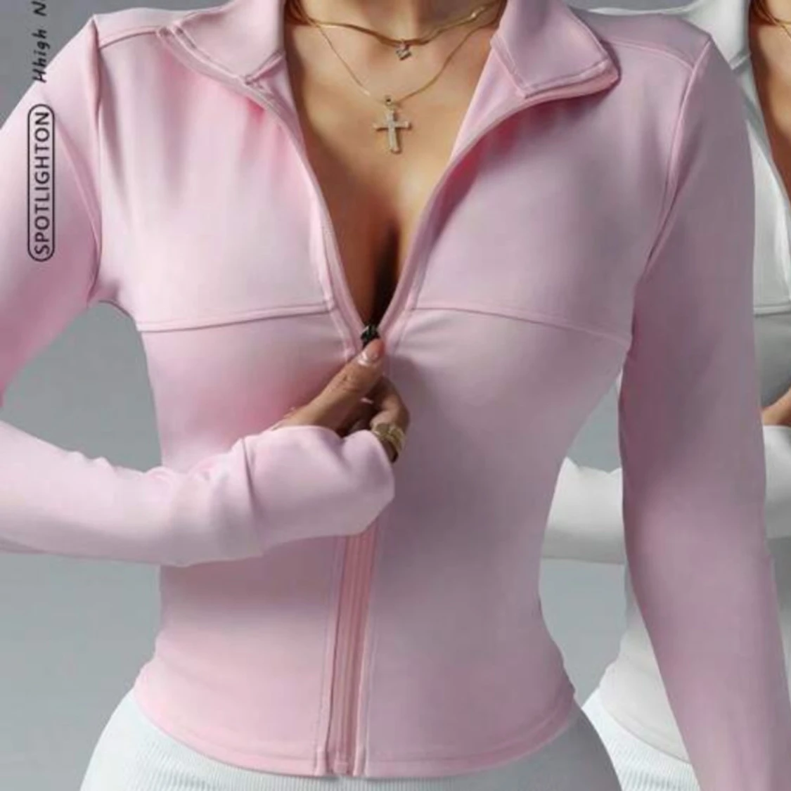 Snygg ljusrosa träningsjacka i stretchigt material med hel dragkedja framtill och hög krage. Jackan har lång ärm med tumhål och figurnära passform som framhäver siluetten. HELT NY ALLDRIG ANVÄNT💓💓💓