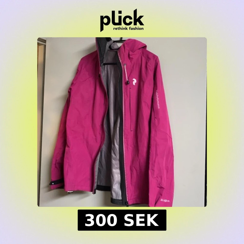 Snygg rosa skaljacka från Peak Performance med justerbar huva och dragkedja framtill. Jackan har långa ärmar med kardborrejustering vid ärmsluten och är perfekt för utomhusaktiviteter. Märket 'Black Light' syns på ärmen.lite sliten i nacken på insidan men syns inte när man har på sig jackan.
