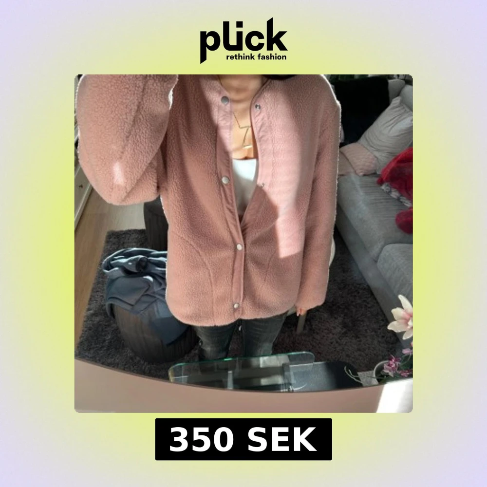 Mysig rosa teddyjacka med quiltad insida och tryckknappar. Perfekt för kyliga dagar med sin vändbara design. Jackan har en rund hals och långa ärmar. Super söt men passar inte mig, inget märke och ingen strl, men gissar p strl S-M Jätte skön och finns små små defekter men inget man tänker på! 🩷🩷