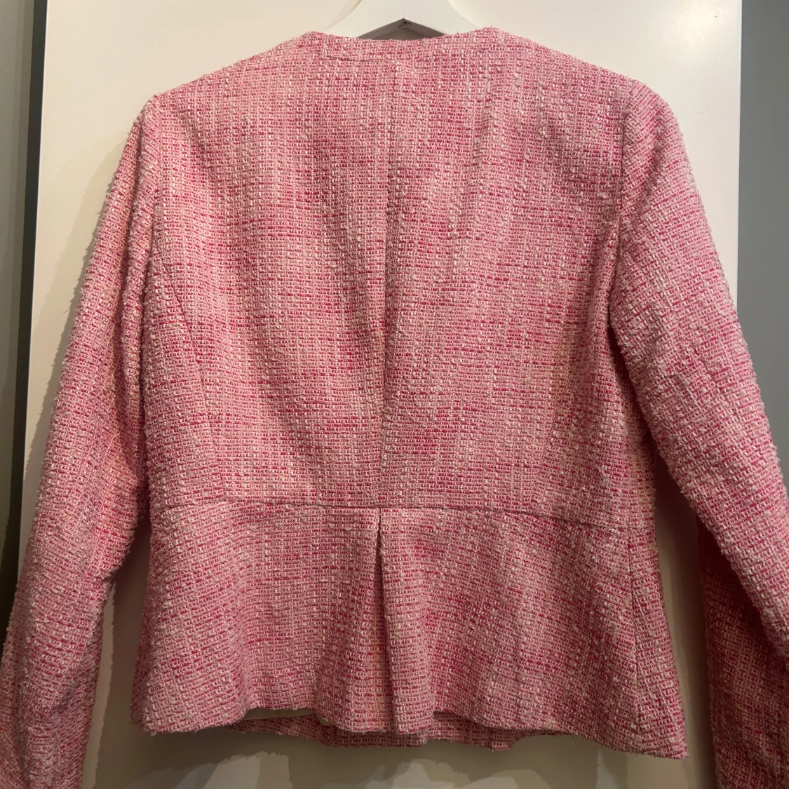 Säljer en stilren rosa jacka med rund hals och dekorativa knappar framtill. Kavajen har en klassisk passform med långa ärmar och två fickor med lock. Perfekt för en chic look!