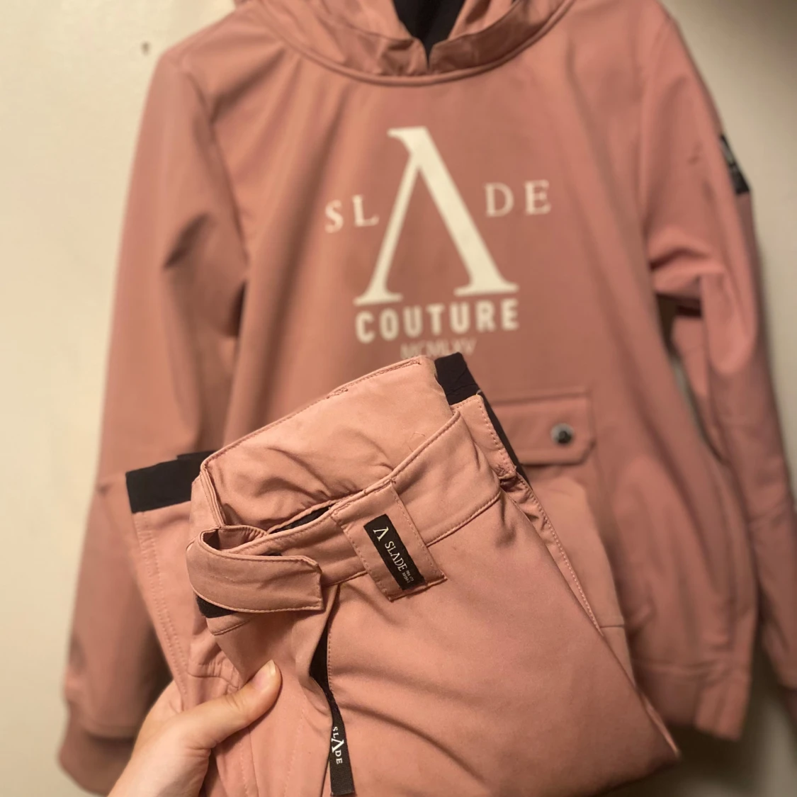 Snygg rosa vindjacka från Slade Couture med stor vit logga framtill och huva. Jackan har praktisk ficka med knapp och är perfekt för dig som gillar streetstyle. Materialet känns mjukt och sportigt, och jackan har långa ärmar. Tillhörande byxor i samma material. Storlek 150kr. Nypris 1500kr, ligger nu på rea för 799kr för bara jackan. Säljer BÅDA för 550kr.