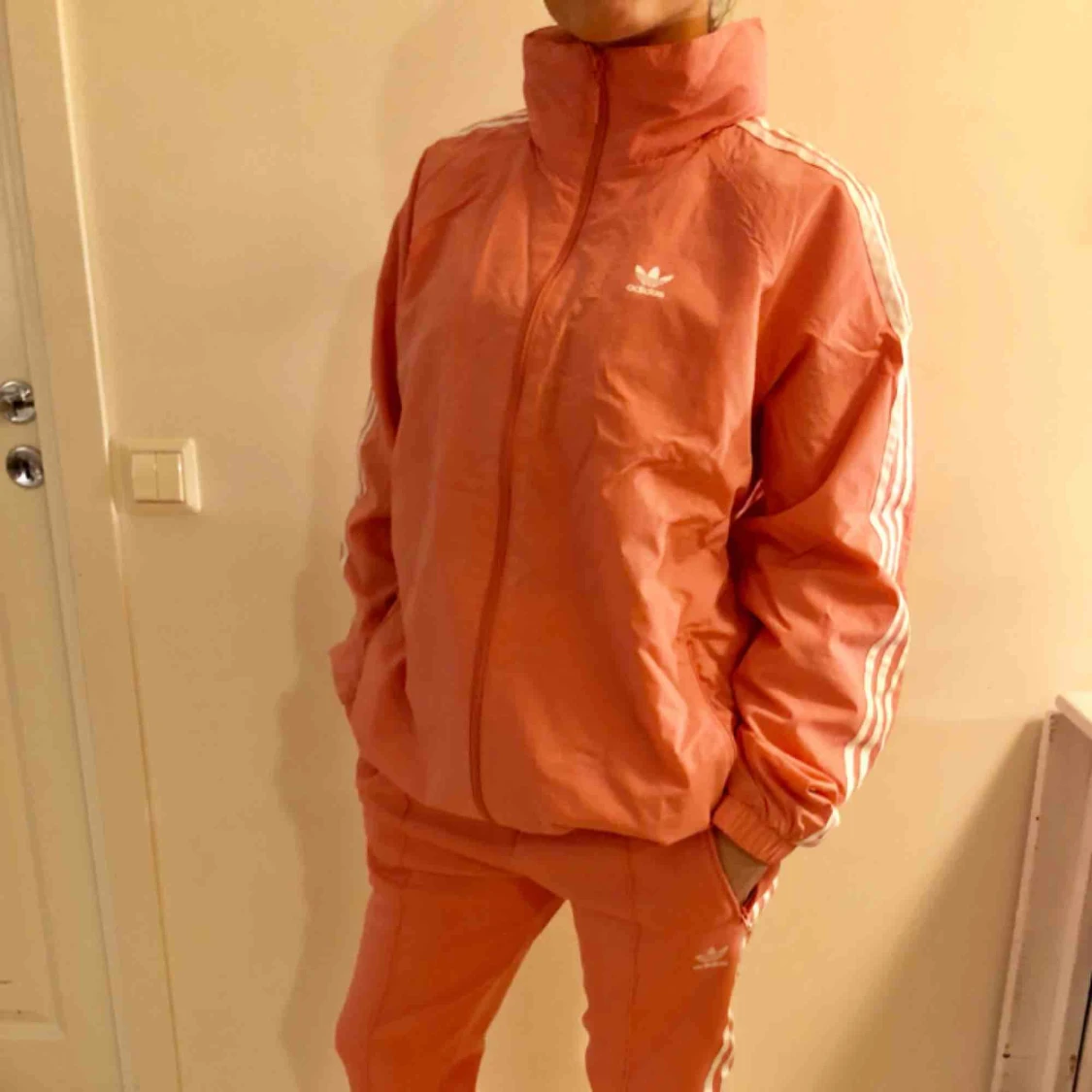 Oanvänd vindjacka från Adidas i färgen peach/gammelrosa. Finns helt set med byxor och crossbodybag/magväska. Köp hela setet för 700 kr