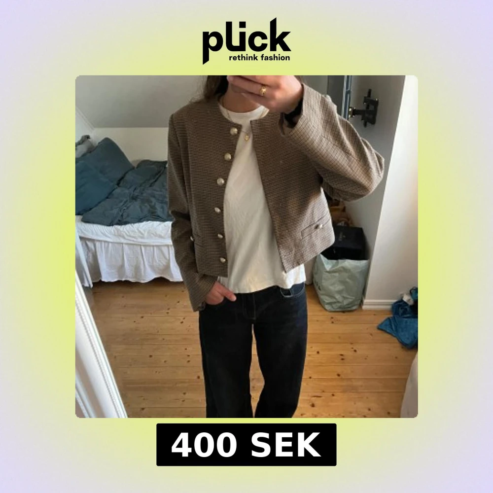 Snygg croppad kavaj i brunt rutigt tyg med guldiga knappar framtill. Från h&m i storlek xs