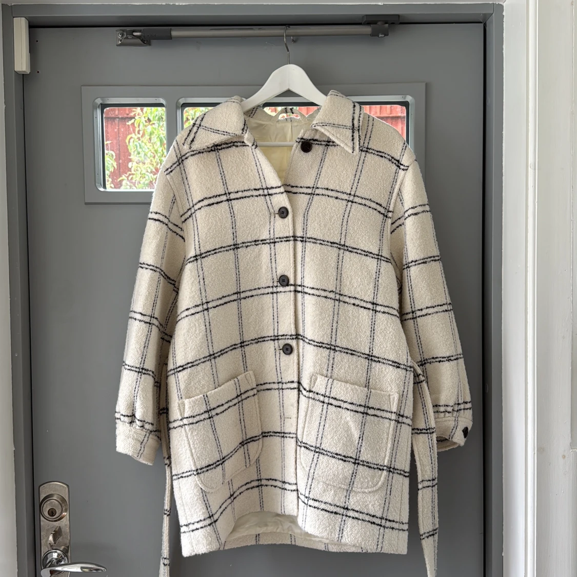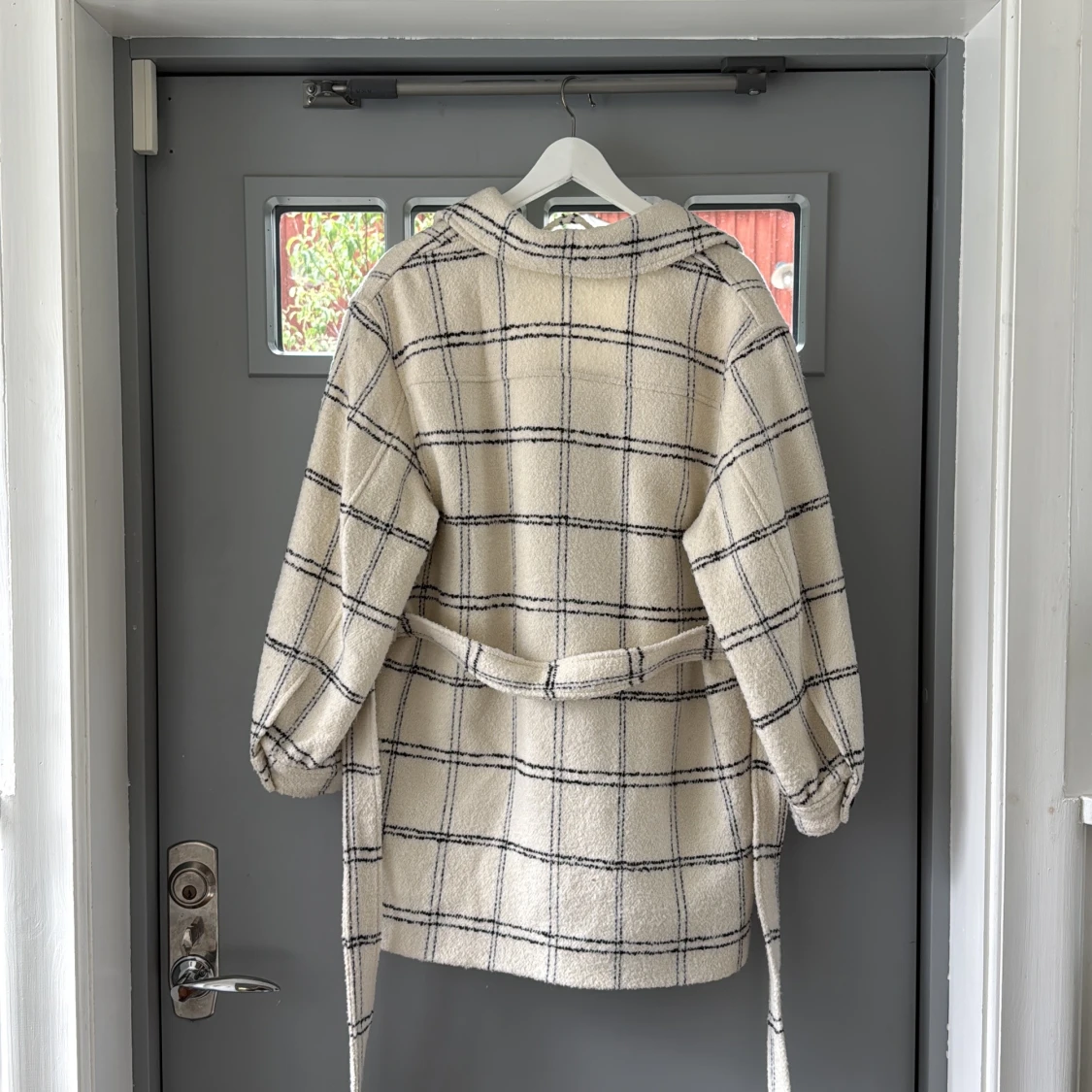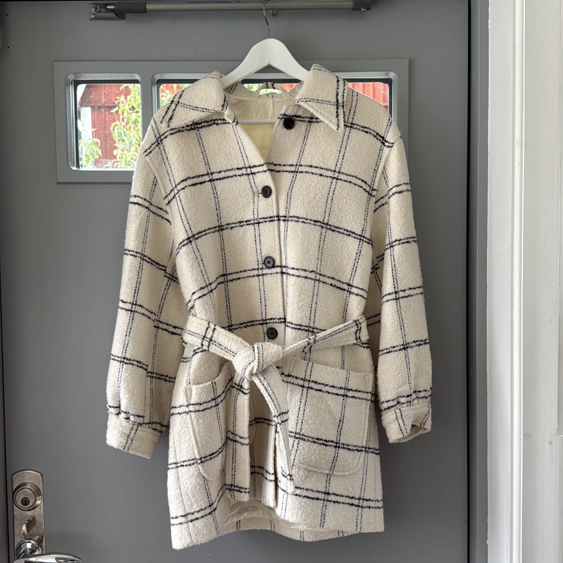 Snygg jacka i naturvitt med svart rutmönster från & Other Stories. Jackan har stora fickor, knappar framtill och ett bälte i midjan för extra stilpoäng. Mjuk / stickad känsla, perfekt för dig som gillar trendiga och bekväma ytterplagg.