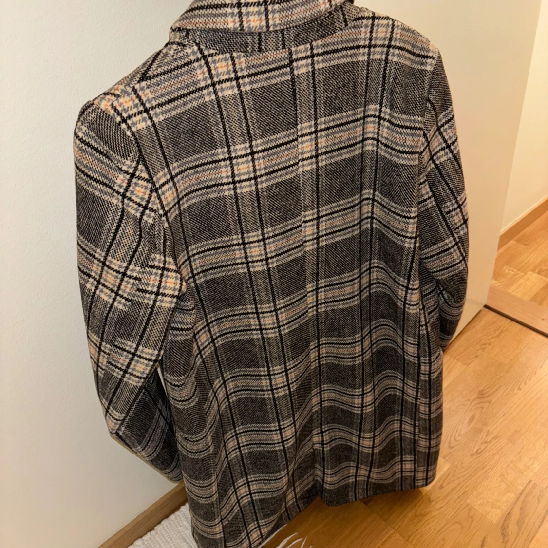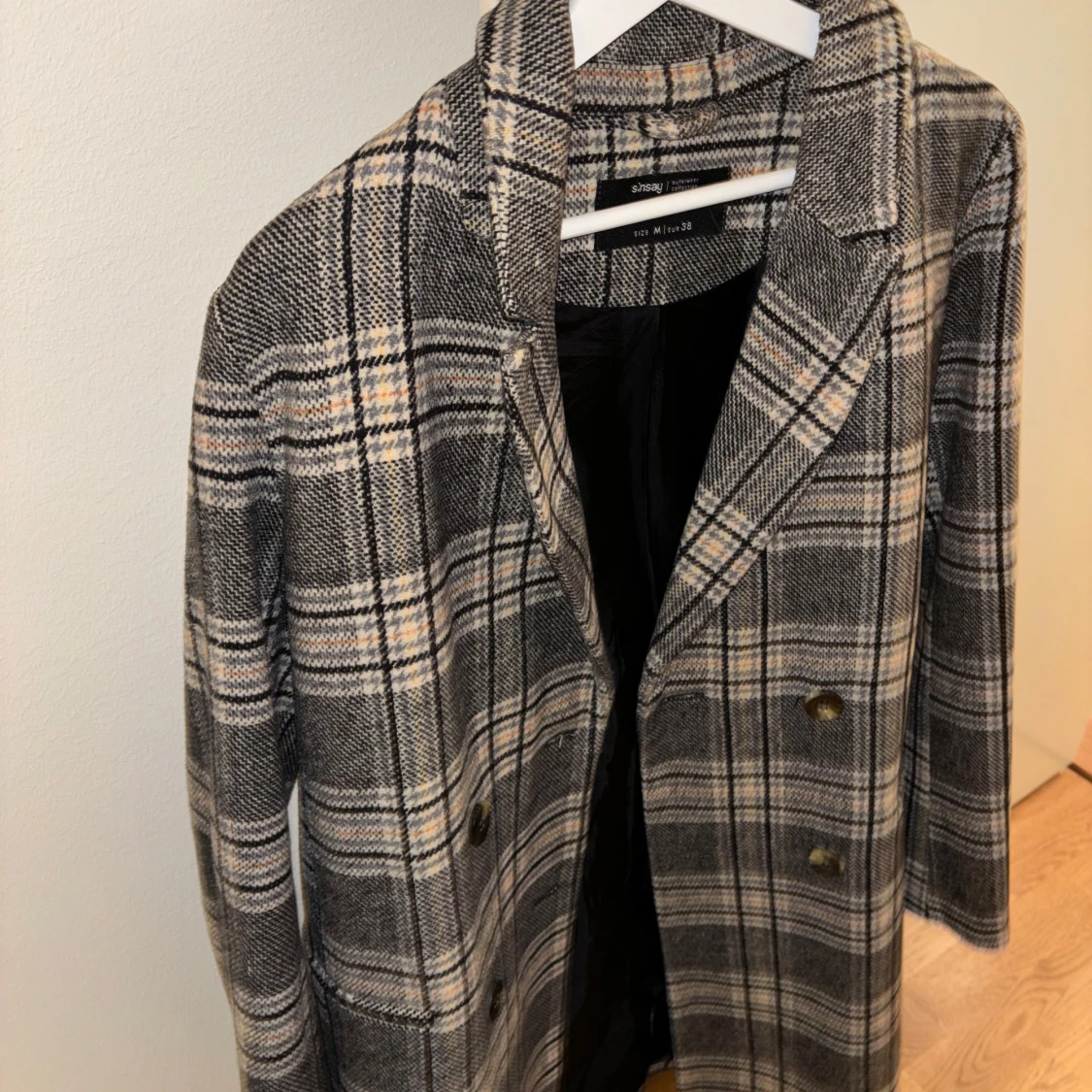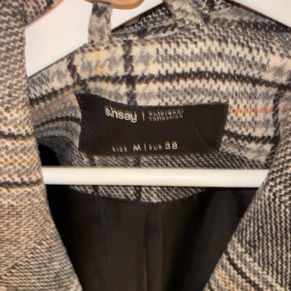 Snygg rutig kappa från Sinsay i storlek M. Den har en klassisk krage och knappar framtill. Perfekt för höst och vår med sitt stilrena mönster i jordnära färger.