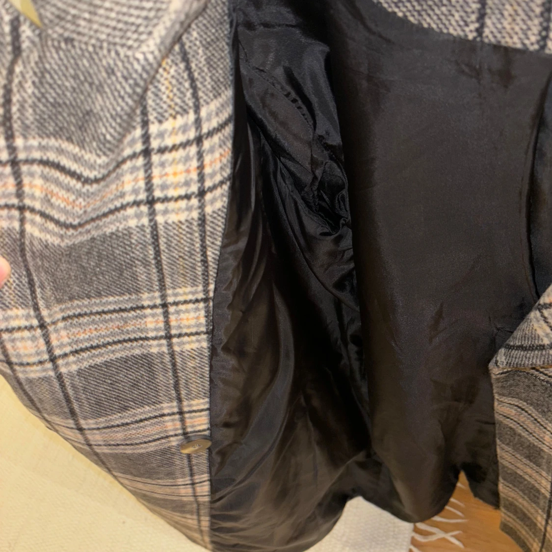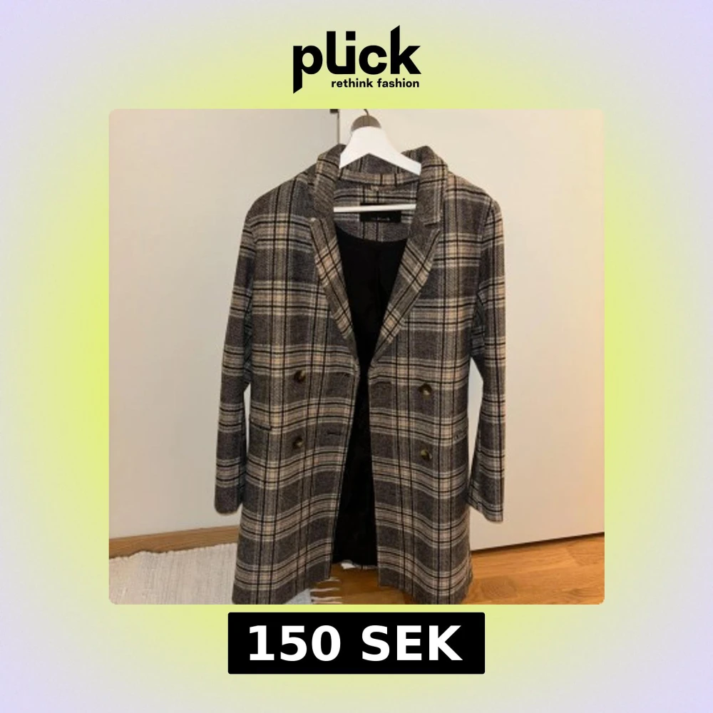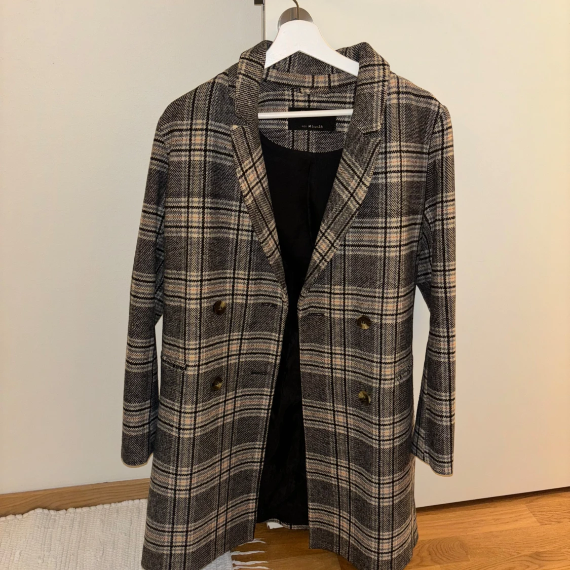 Snygg rutig kappa från Sinsay i storlek M. Den har en klassisk krage och knappar framtill. Perfekt för höst och vår med sitt stilrena mönster i jordnära färger.