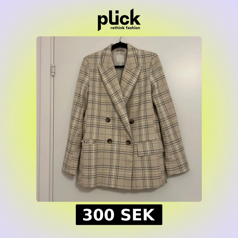 Snygg rutig kavaj från H&M i beige och svart. Dubbelknäppt design med klassisk krage och långa ärmar. Perfekt för en stilren look. Ordentligt och robust material. Oversize, passar 34-36