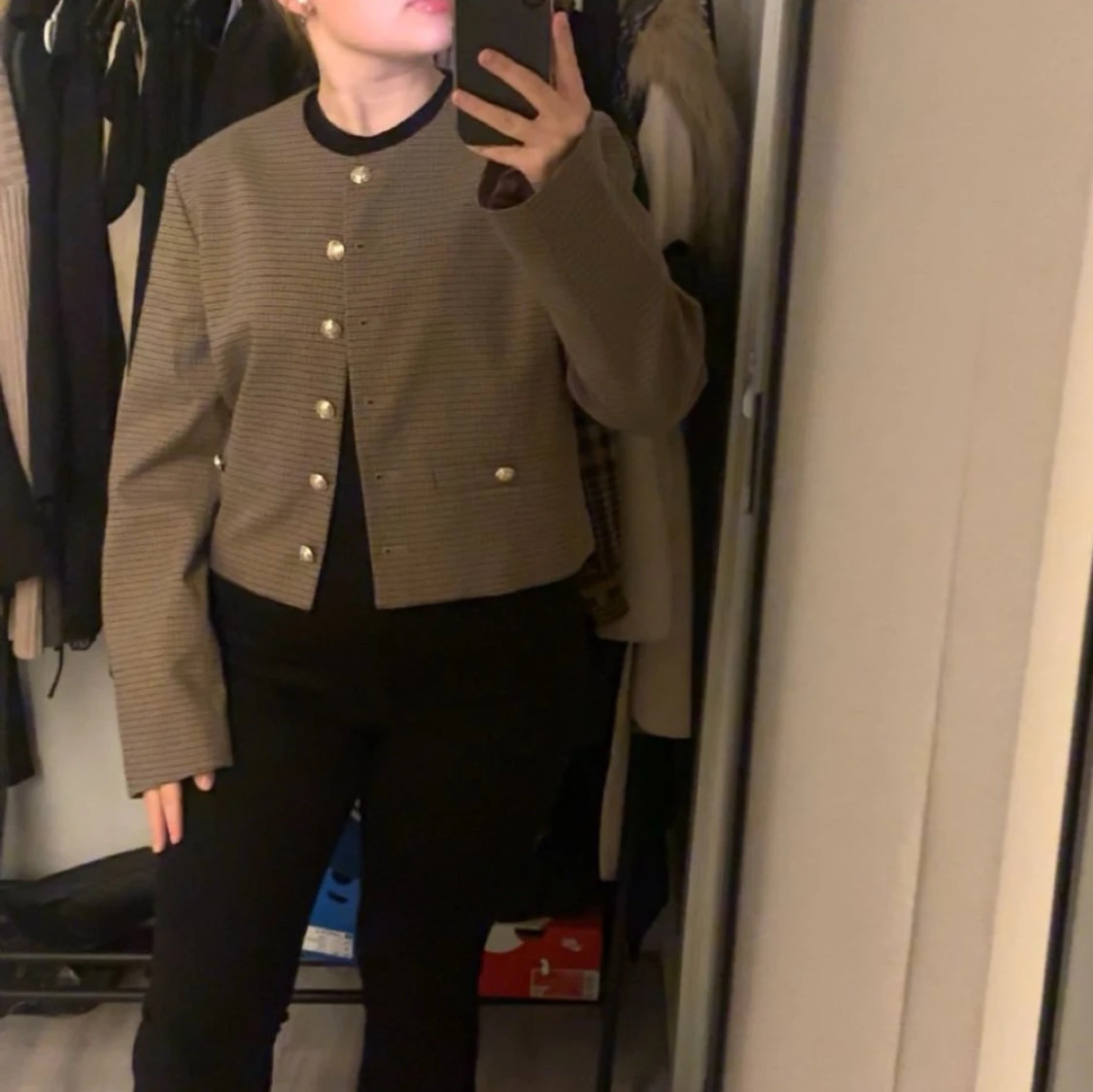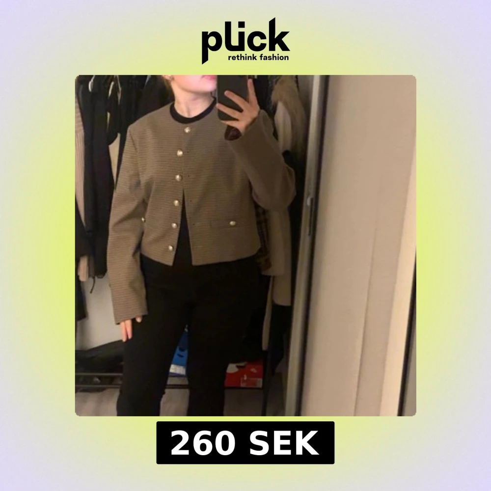Snygg rutig kavaj med guldknappar framtill. Den har en klassisk design med långa ärmar och en rak passform. Perfekt för att ge en stilren touch till din outfit.