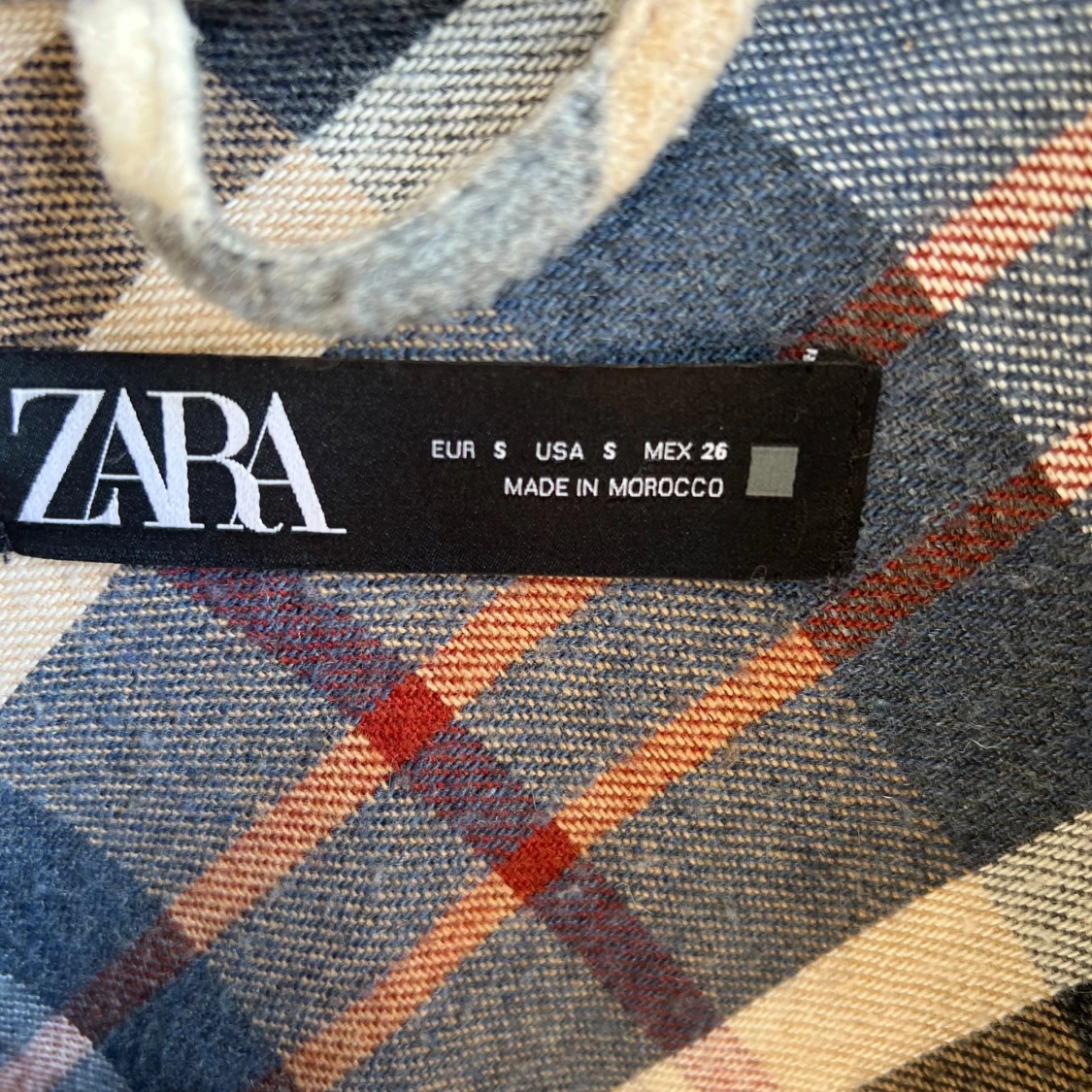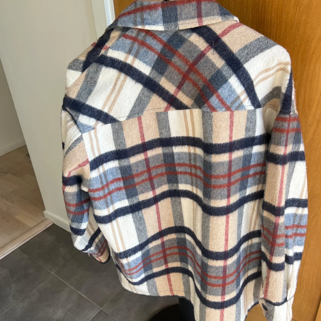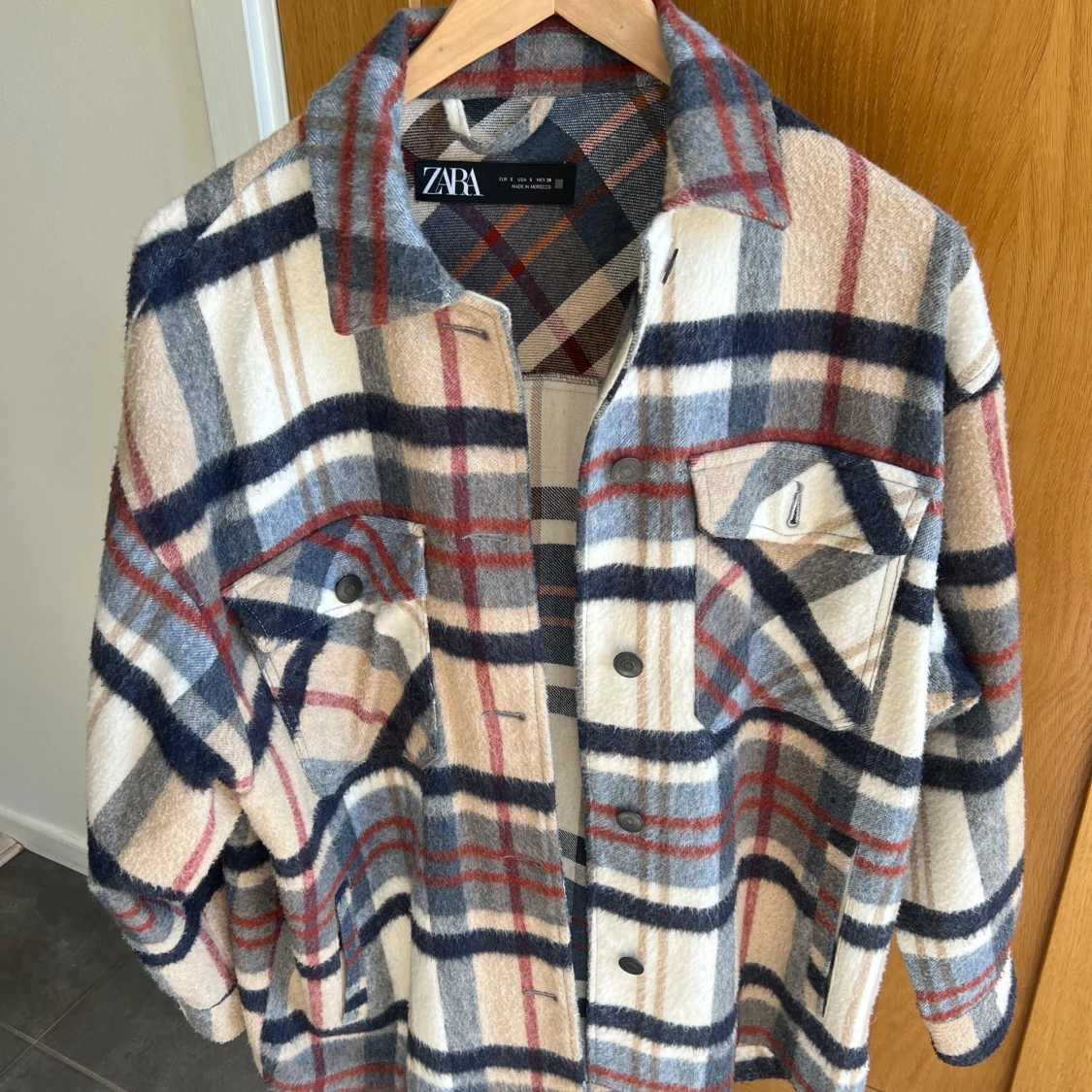 Snygg rutig overshirt från Zara i beige, blått och rött. Jackan har klassisk krage, knappar framtill och två bröstfickor med lock. Perfekt lager-på-lager-plagg med lite oversized känsla och mjuk ullmix som håller dig varm.