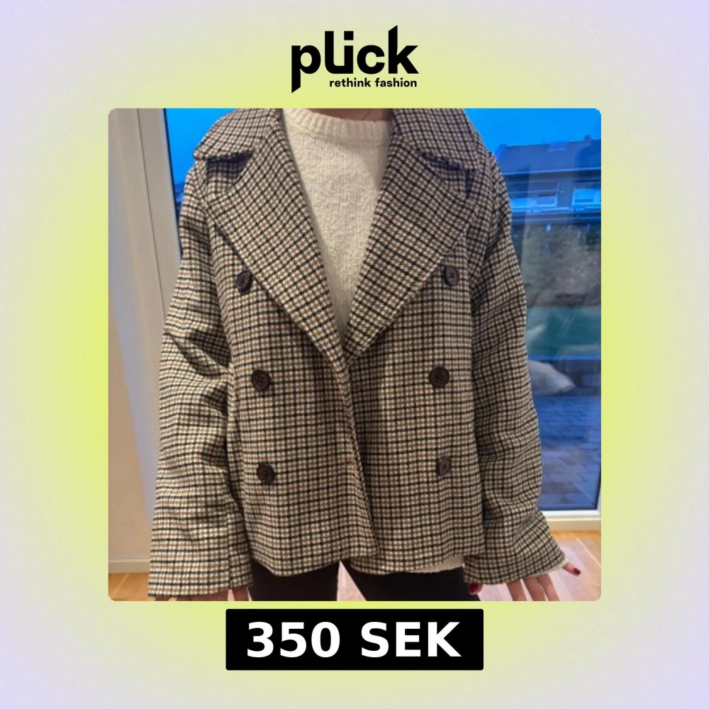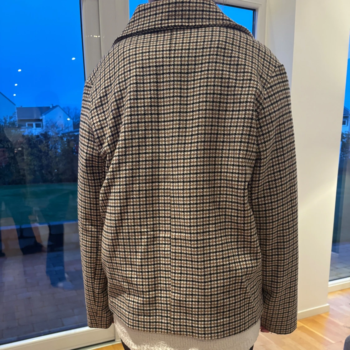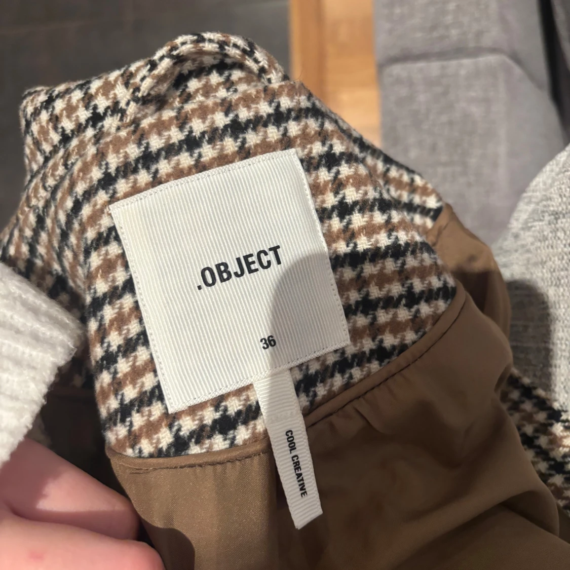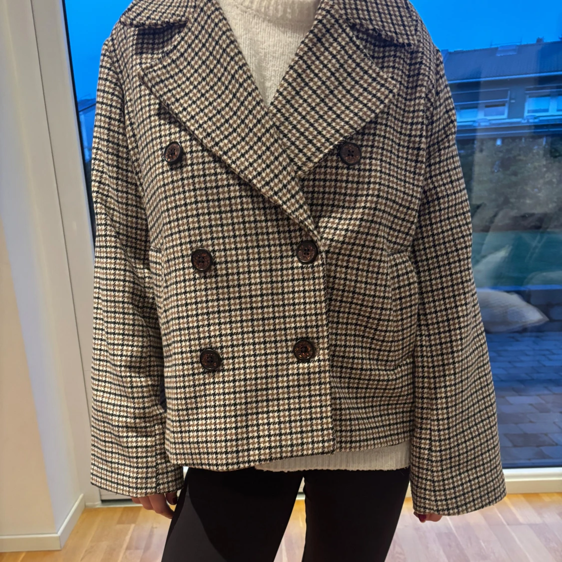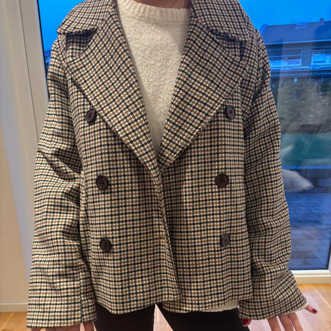Snygg rutig skepparkavaj från Object i bruna, svarta och vita toner. Jackan har dubbelknäppning med stora knappar, bred krage och en loose passform. Nypris 85å