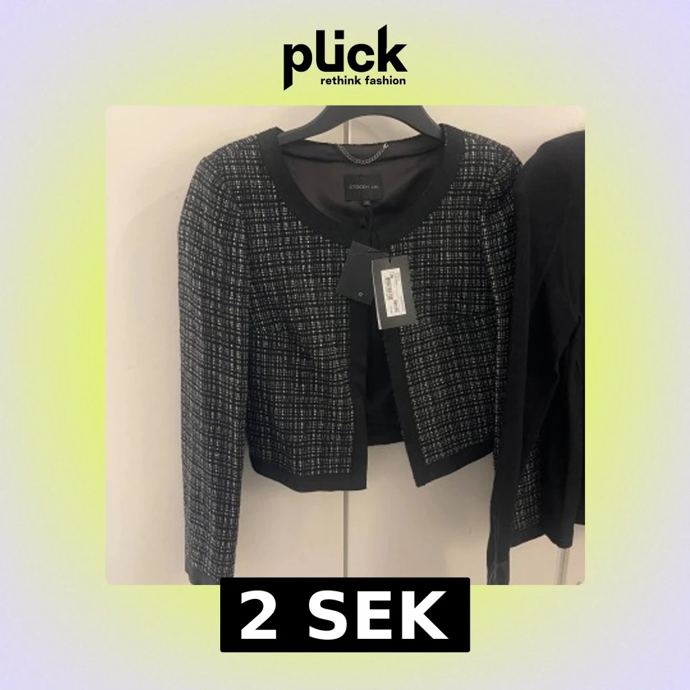 Snygg svartvit rutig kavaj från Stockh LM med rundad halsringning och croppad passform. Jackan har långa ärmar och är tillverkad i ett mjukt tyg med diskret struktur. Perfekt för dig som vill ha en stilren och trendig look.