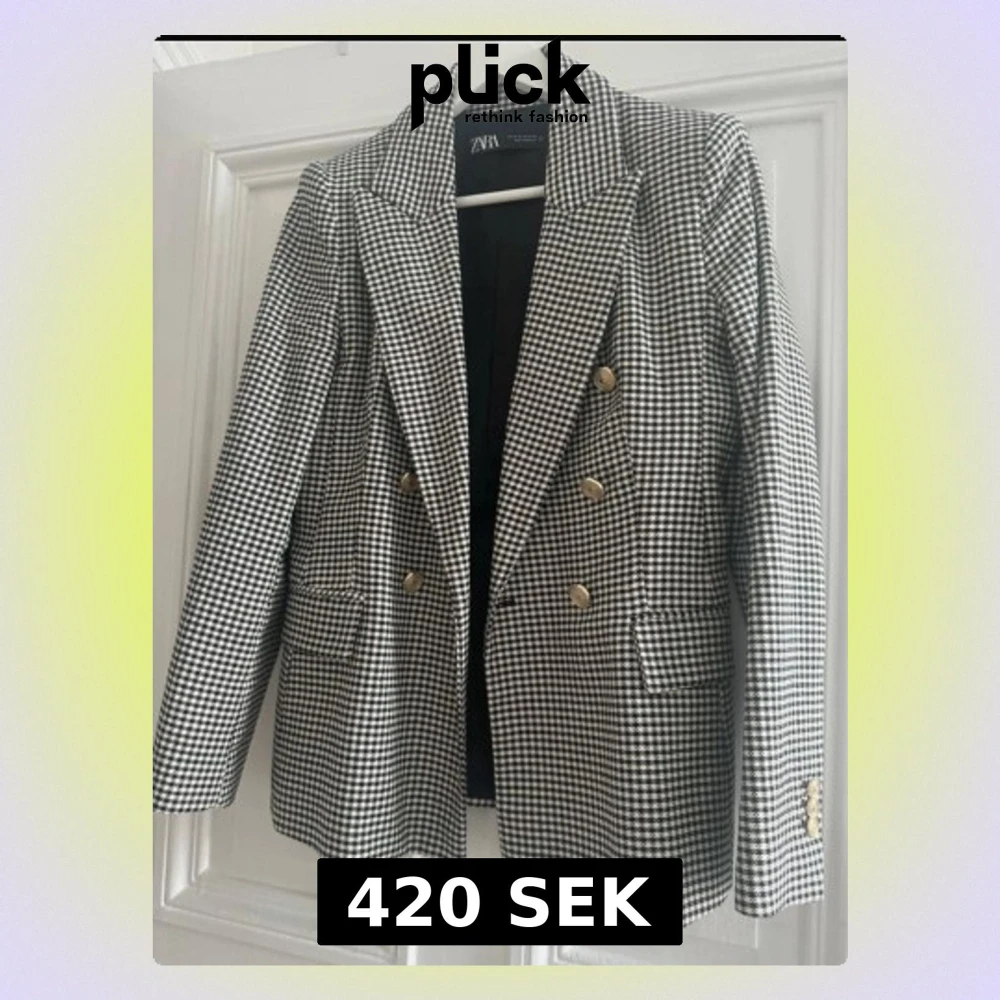 Snygg svartvit rutig kavaj från Zara med dubbelknäppning och guldiga knappar. Klassisk modell med bred krage och fickor framtill. Perfekt för dig som vill ha en stilren och trendig look. Materialet är mjukt och följsamt, troligtvis polyesterblandning.