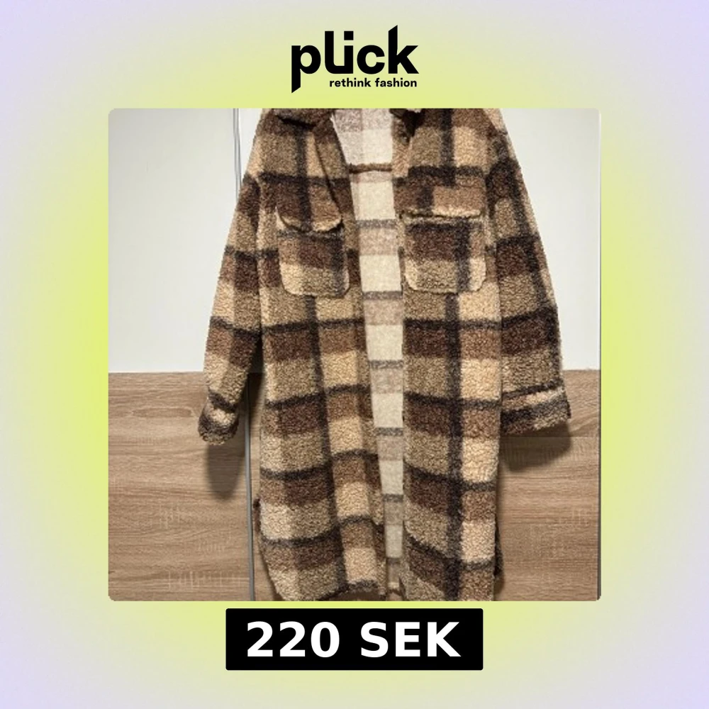 Mysig teddyjacka med rutigt mönster i beige, brunt och mörkbrunt. Jackan har två stora bröstfickor med lock, lång ärm och en oversized passform. Perfekt för kalla dagar när du vill ha både stil och komfort. Har även slits på sidorna, endast använd ett fåtal gånger.