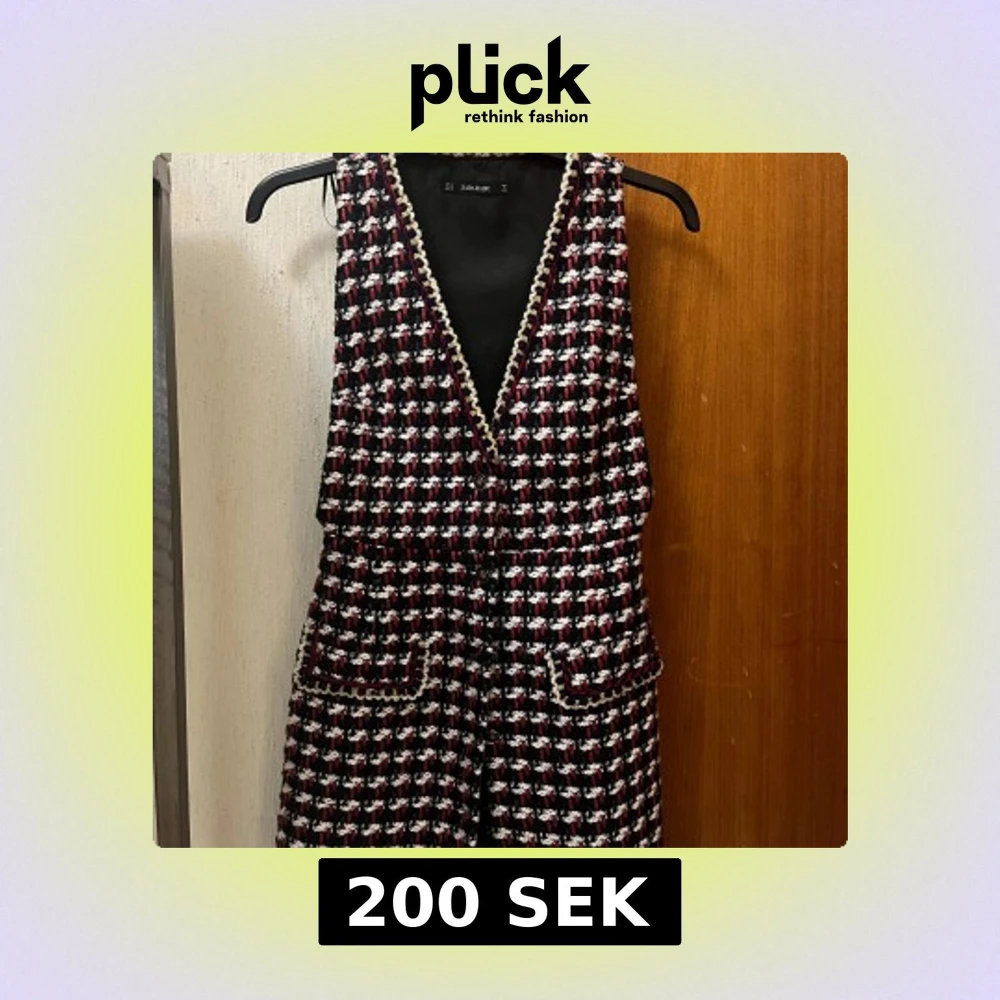 Säljer en snygg rutig väst från Zara Basic i färgerna svart, vit och röd. V-ringad modell med dekorativa guldkanter och två fickor framtill. Perfekt för att lyfta din outfit med en trendig touch.
