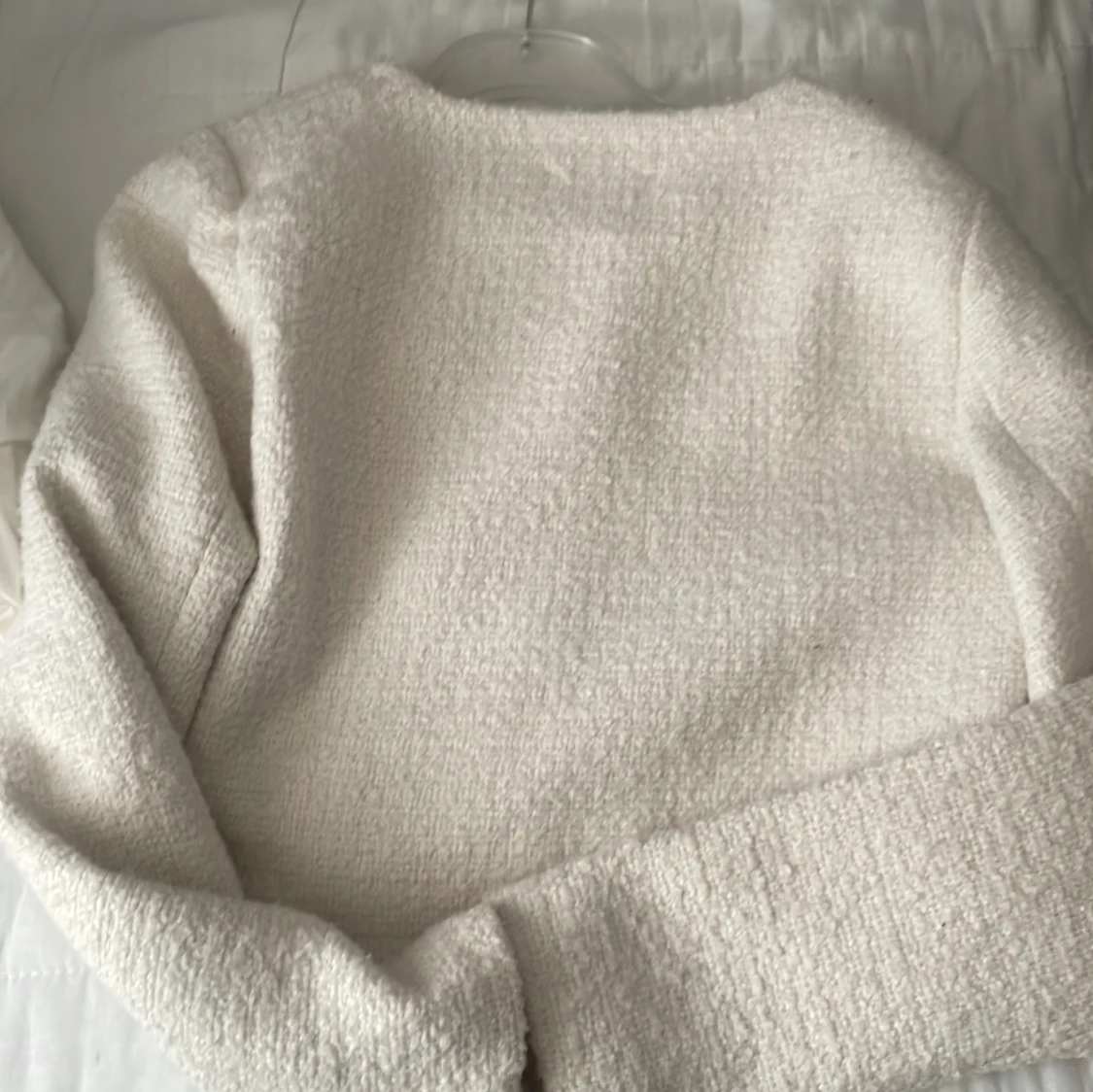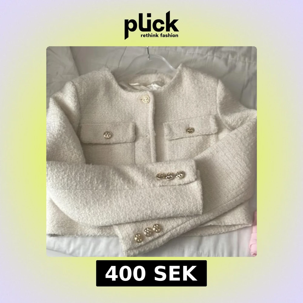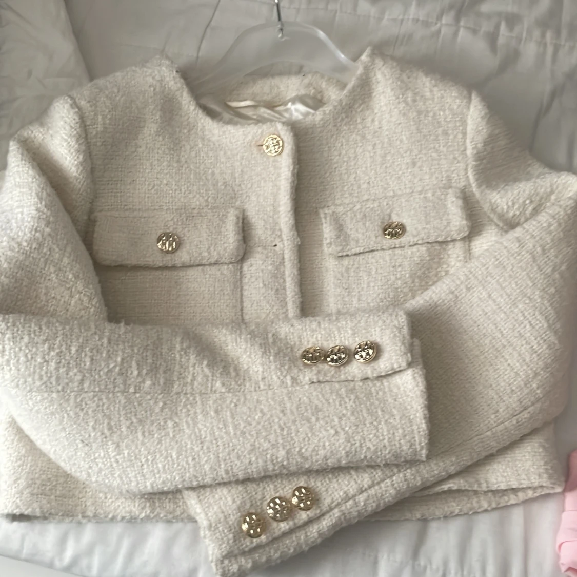 Säljer en stilren vit kavaj i strukturerat tyg med snygga guldknappar framtill och på ärmsluten. Jackan har två fickor med lock och en rak, croppad passform. Säljer den föe den inte kommer till användning
