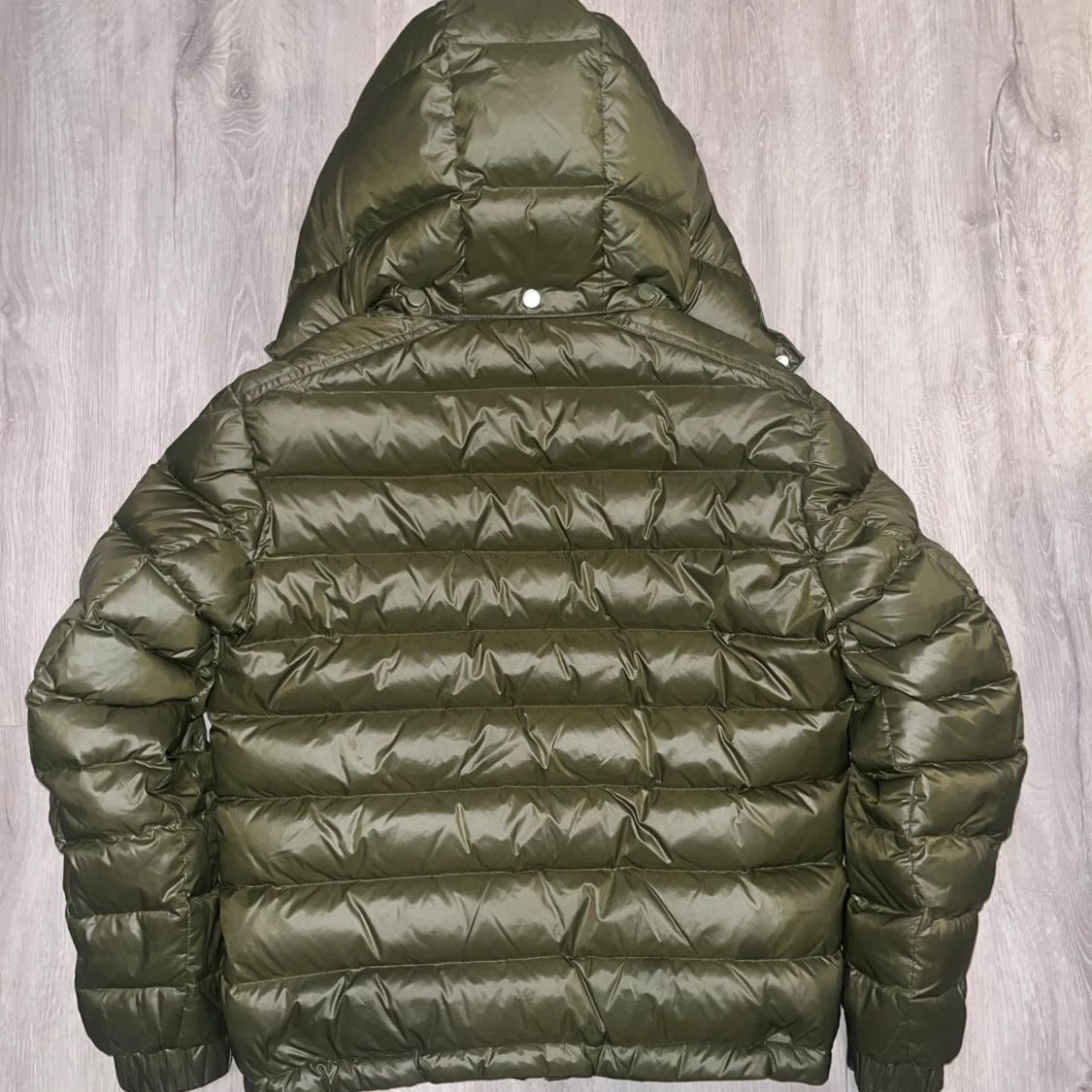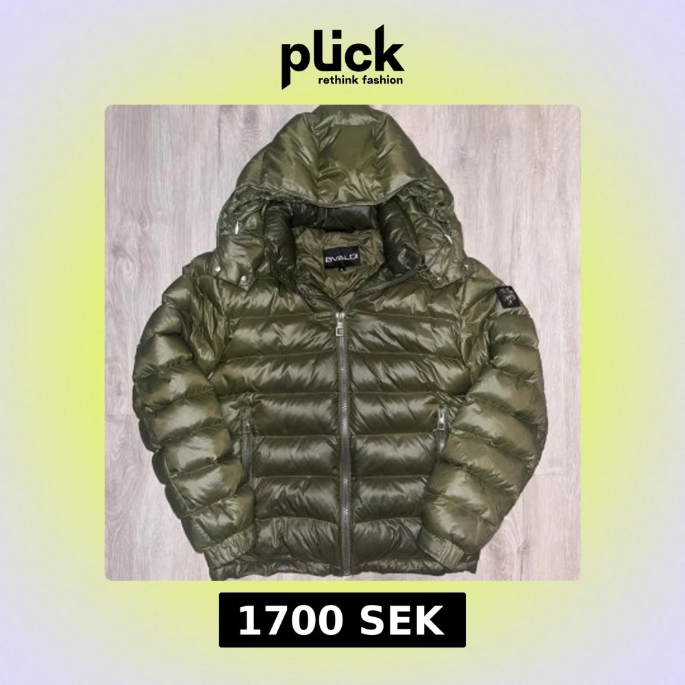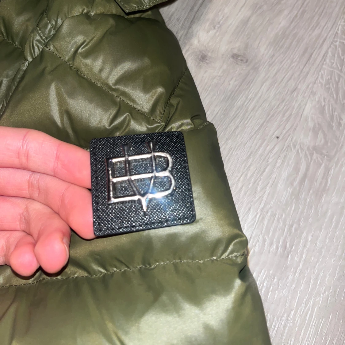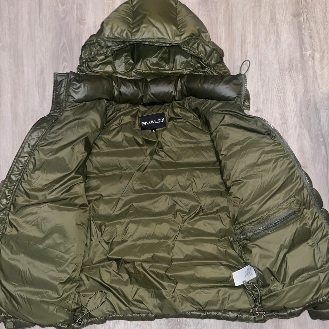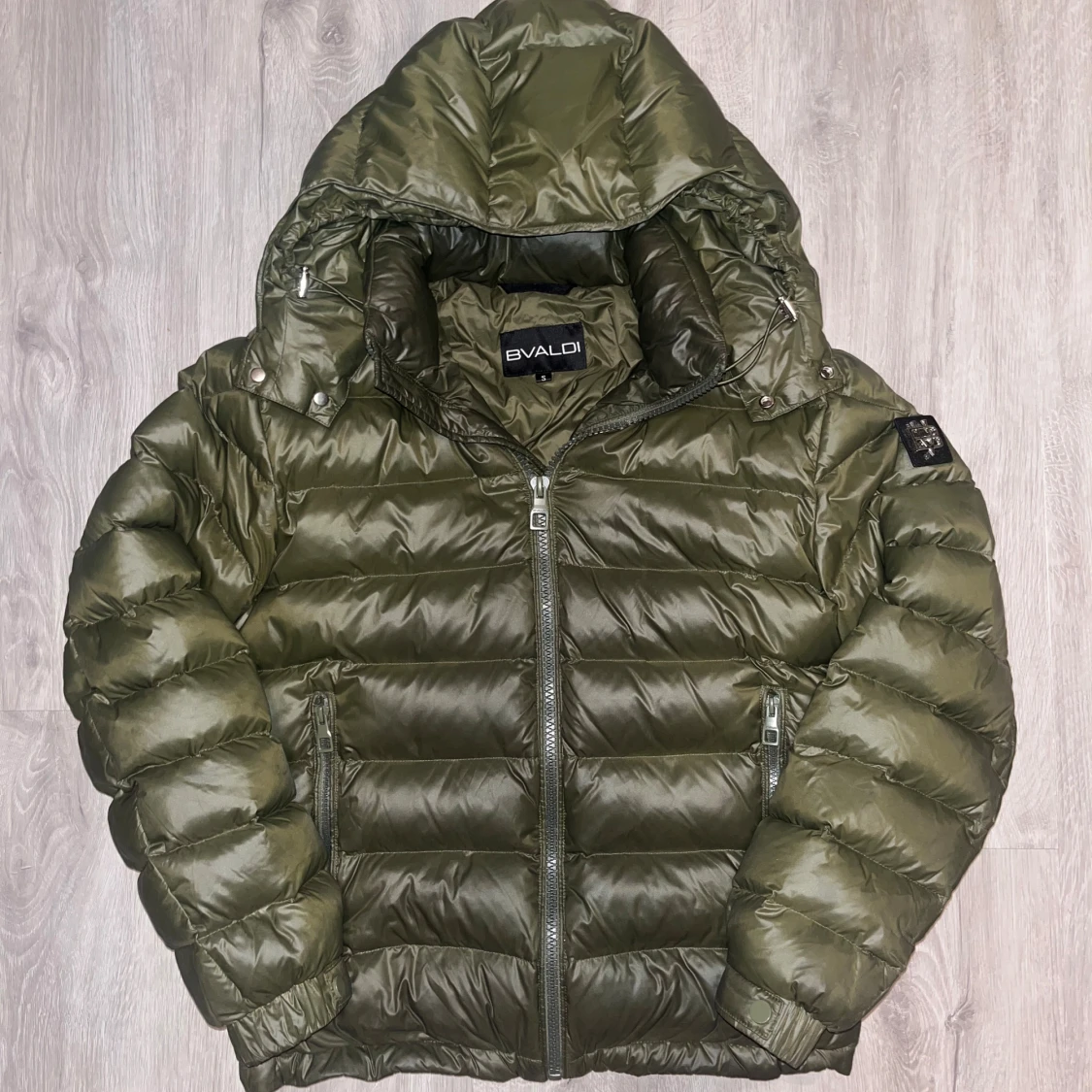 Snygg olivgrön pufferjacka från Bvaldi med huva och dragkedja framtill. Jackan har två fickor med dragkedja, quiltad design och en svart logotyp-patch på ärmen. Perfekt för kalla dagar och riktigt skön att bära. Logotypen på ärmen har lossnat lite inga andra skador. Skriv vid funderingar.