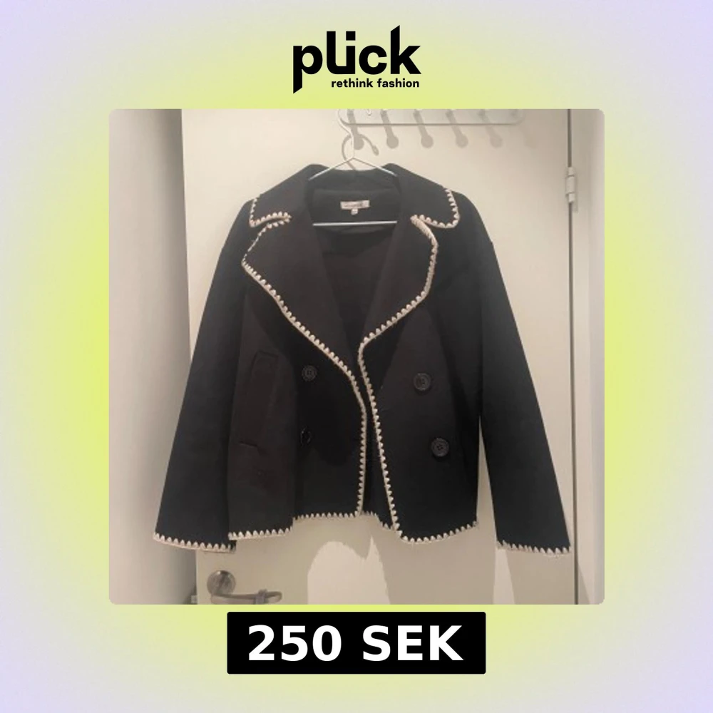 Snygg svart kappa från Disign by si med vita kantdetaljer. Dubbelknäppt design och långa ärmar. Perfekt för en stilren look. Pris kan diskuteras, skriv för fler bilder. Frakt ingår ej