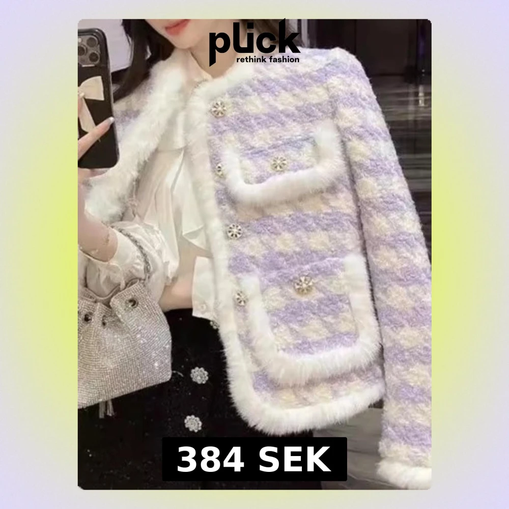 Superfin teddyjacka i ljuslila och vit rutig design med fluffiga pälsdetaljer längs kanterna och fickorna. Jackan har glittriga knappar och två framfickor, perfekt för dig som gillar en söt och trendig look. Passformen är normal och jackan är långärmad.