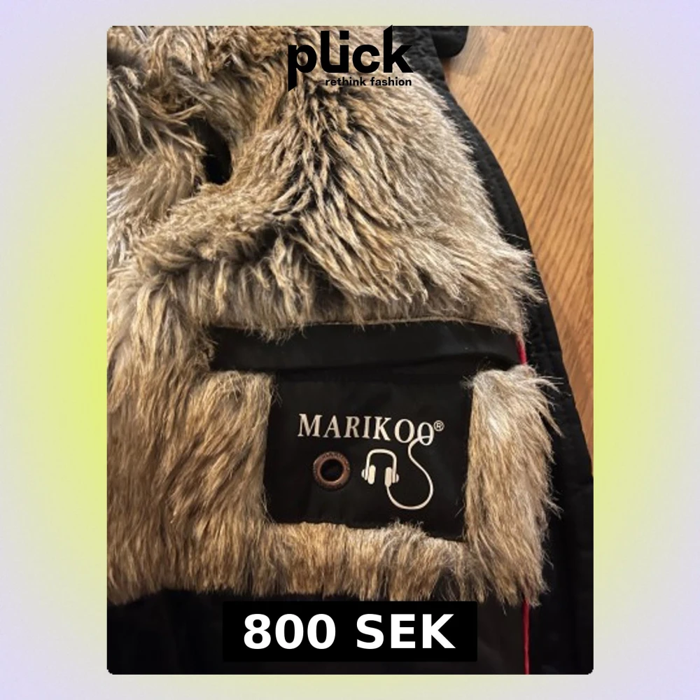Säljer en svart vinterjacka från Marikoo i storlek S. Jackan har ett quiltat innerfoder och är fodrad med mjuk, beige fuskpäls på insidan och i huvan. Materialet är polyester och jackan har snygga detaljer som logga och hörlursuttag.