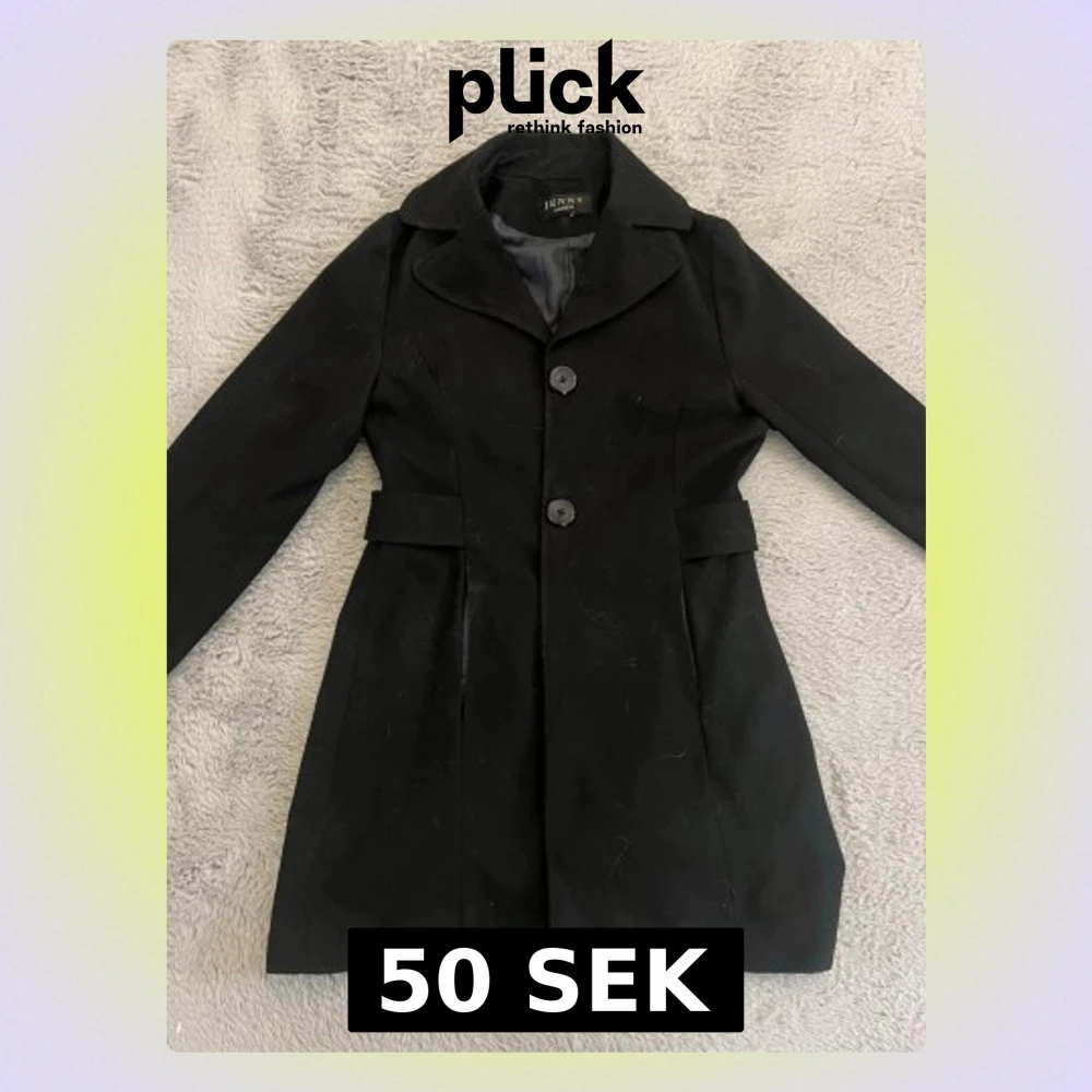 Stilren svart kappa från Jenny Fashion med klassisk krage och två stora knappar framtill. Jackan har markerad midja, långa ärmar med knappdetalj vid mudden och slät yta. Perfekt för dig som gillar en enkel men elegant look. Den har lite katthår på sig men utöver det är den i väldigt bra skick! Passar perfekt till höst eller vår (den är lite för tunn för vintern och lite för tjock för sommaren)