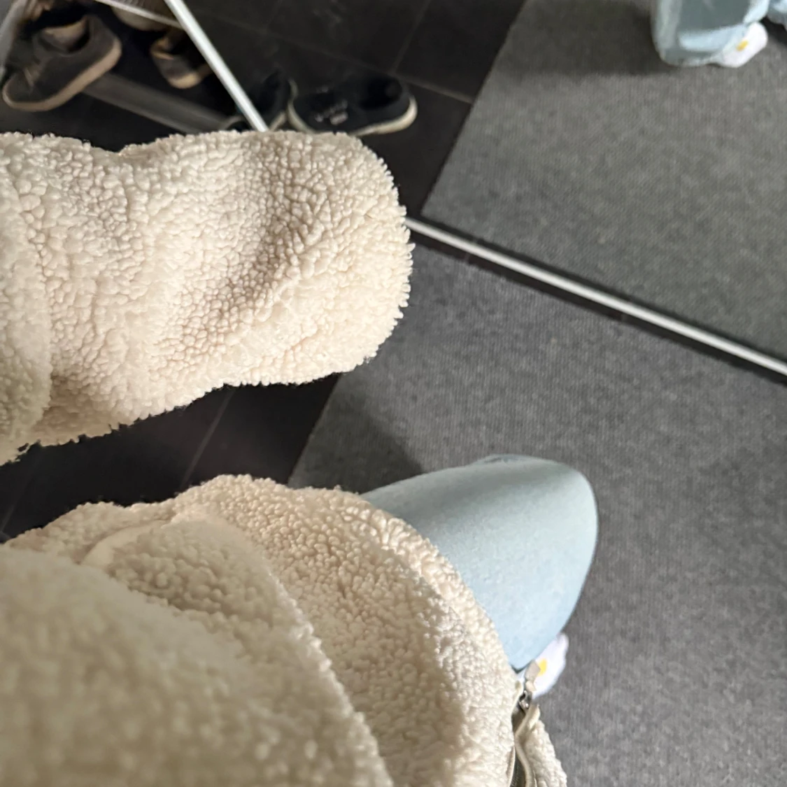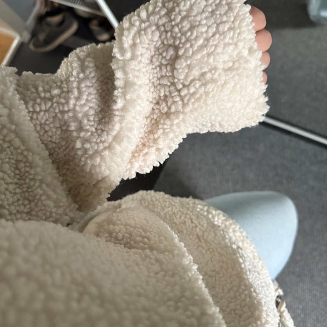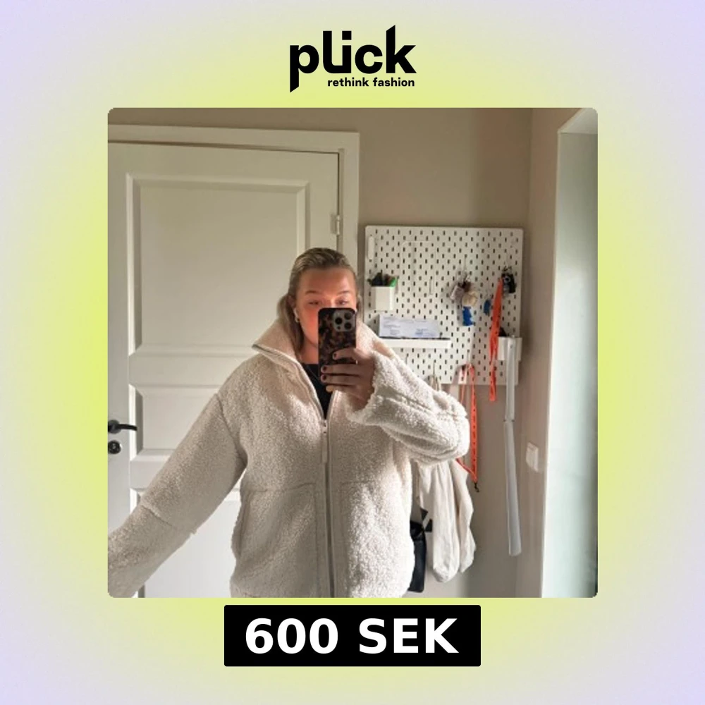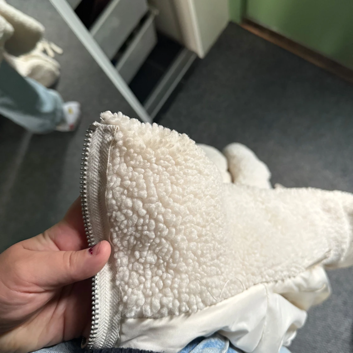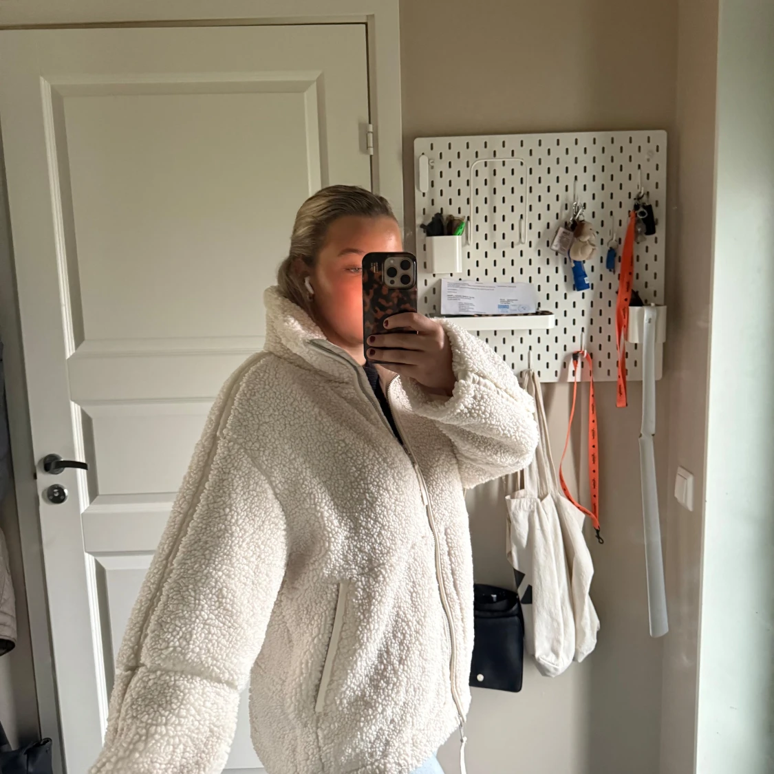 Mysig och oversized teddyjacka i vit med hög krage och dragkedja framtill. Perfekt jacka nu till hösten. Den har inga sminkfläckar eller defekter!