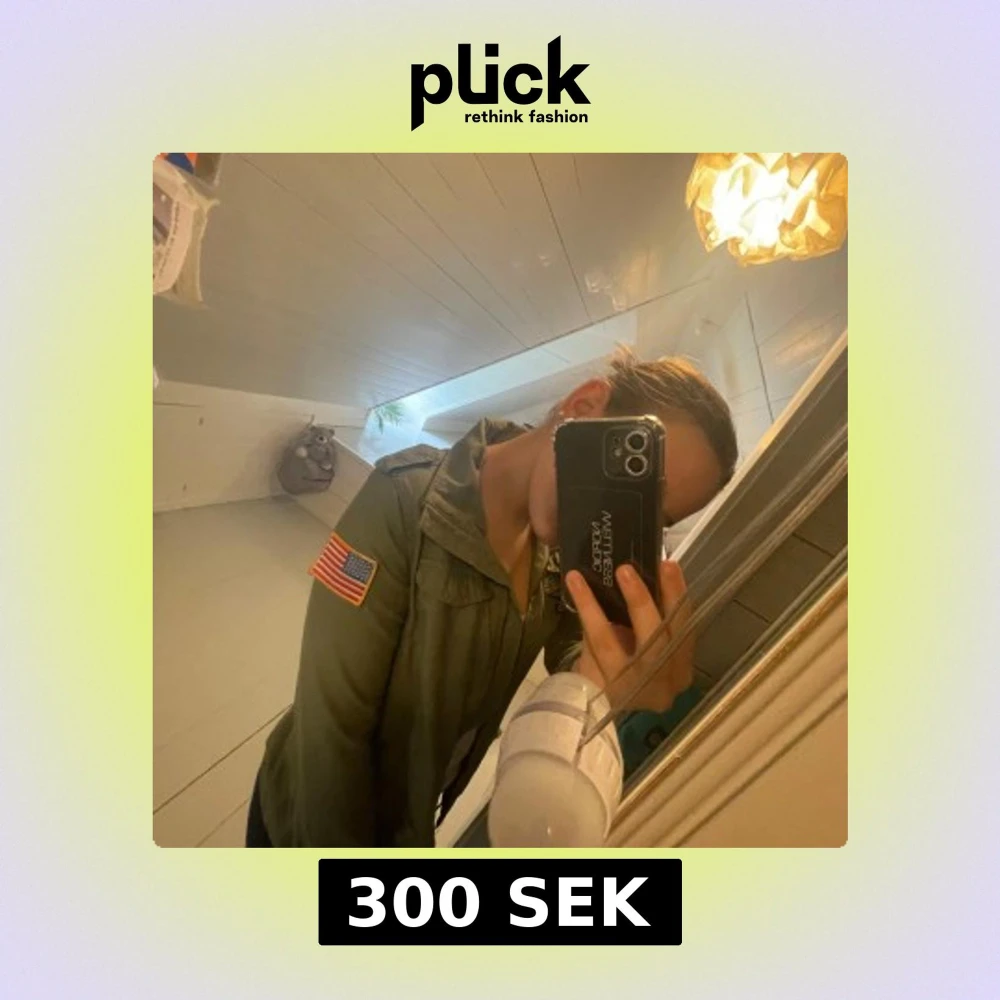 Säljer en olivgrön jacka med dragkedja och flera fickor framtill. Jackan har patchar, bland annat en amerikansk flagga på ärmen och en gul broderad detalj på bröstet. Perfekt för dig som gillar utility-stil. Pris kan diskuteras❣️