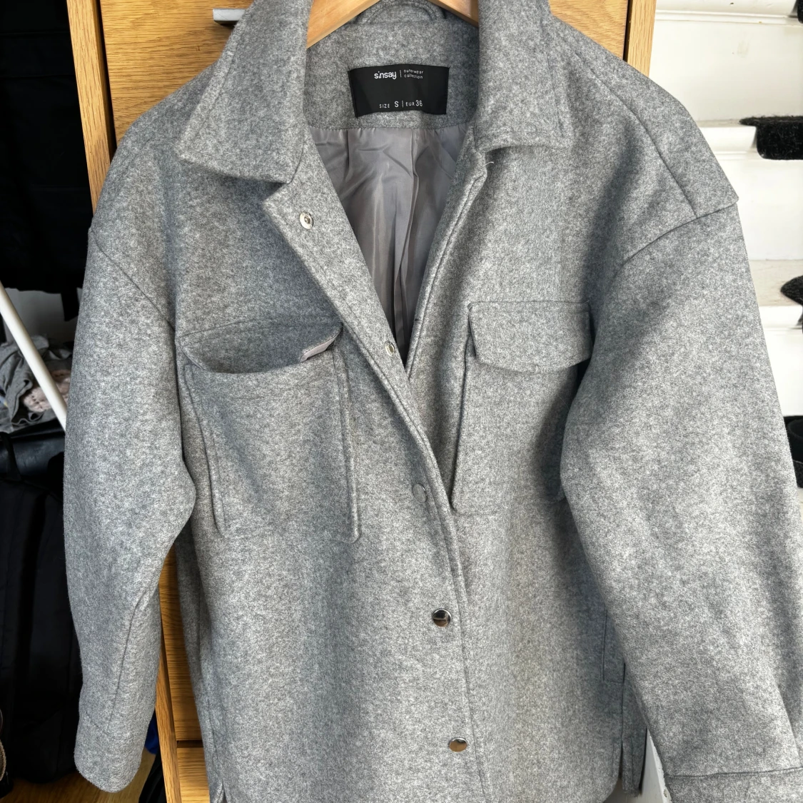 Jättefin jacka lite större modell. Upplever att den är kort i ärmarna. Helt och fint skick. Katt finns i hemmet.