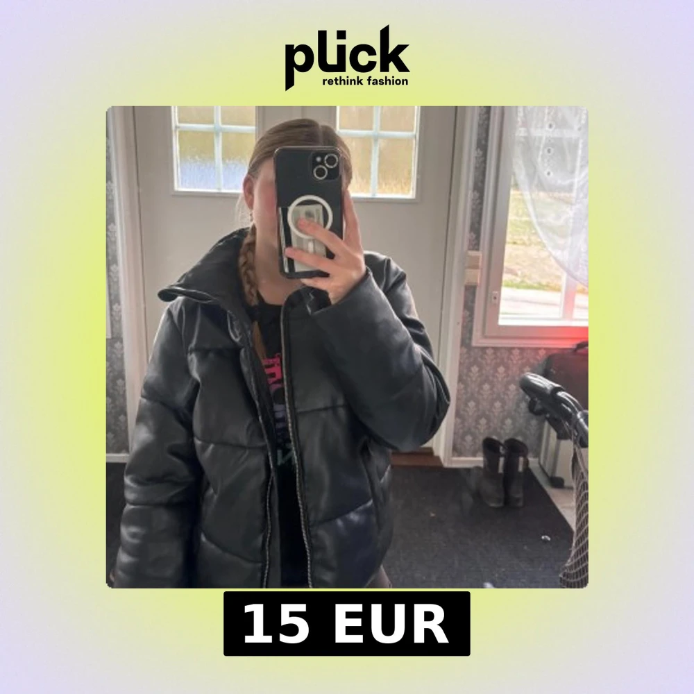 Säljer en svart pufferjacka med hög krage och dragkedja framtill. Perfekt för kyligare dagar och ger en cool look.