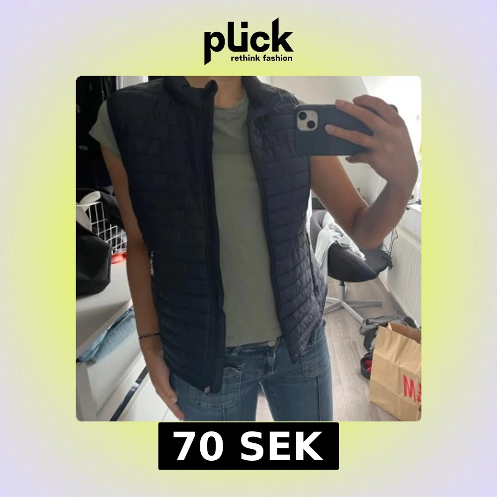 Snygg marinblå quiltad dunväst med dragkedja framtill. Perfekt för lager-på-lager under kyligare dagar. Västen har en hög krage och två praktiska fickor med dragkedja. Dragkedjan har jag tyvärr slarvat bort men det går att stänga. Enkelt att sätta på ett nytt💕