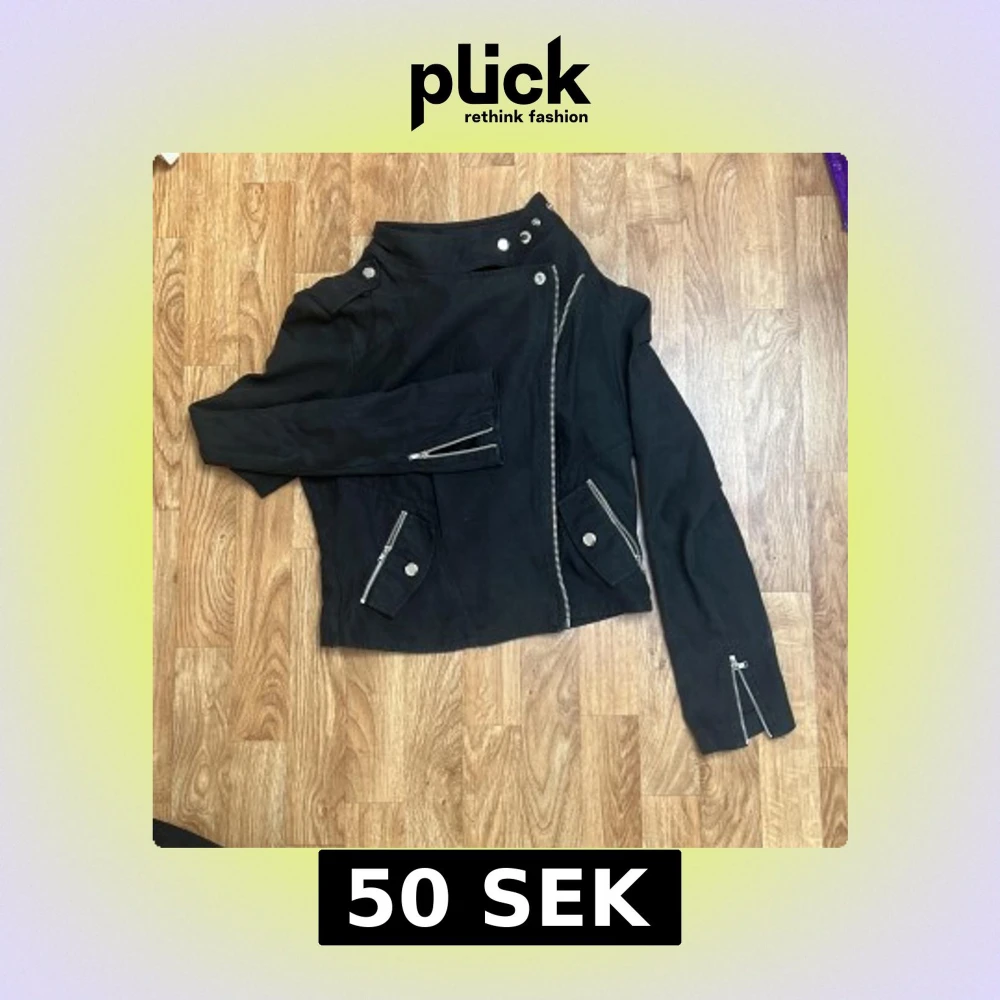 Svart tunn bikerjacka från Saints & Mortals i storlek S. I mockaimitation. Jackan har coola silvriga dragkedjor, knappar och detaljer vid kragen. Asymmetrisk dragkedja framtill. Använd fåtal gånger.