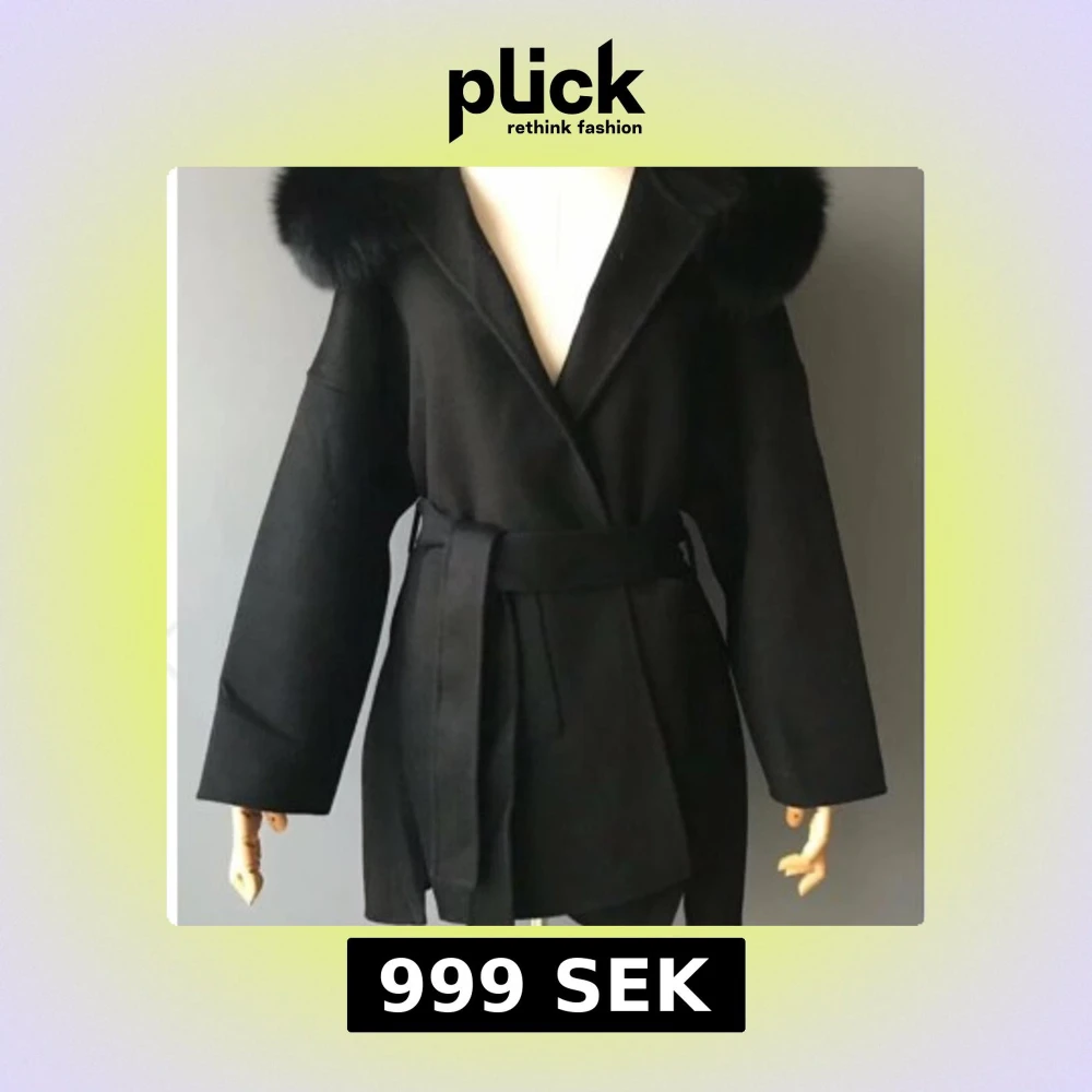 Stilren svart kappa med breda ärmar, stor huva med fluffig fuskpäls och knytbälte i midjan. Perfekt för dig som vill ha en klassisk look med en twist. Kappan har omlottstängning och ger en snygg siluett.