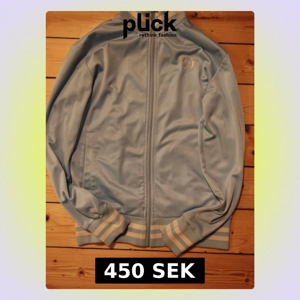 Ljusblå vindjacka från Sergio Tacchini med dragkedja framtill och broderad logga på bröstet. Jackan har ribbade muddar och krage med vita ränder samt två sidofickor. Tillverkad i mjuk polyester för en sportig och retro look.