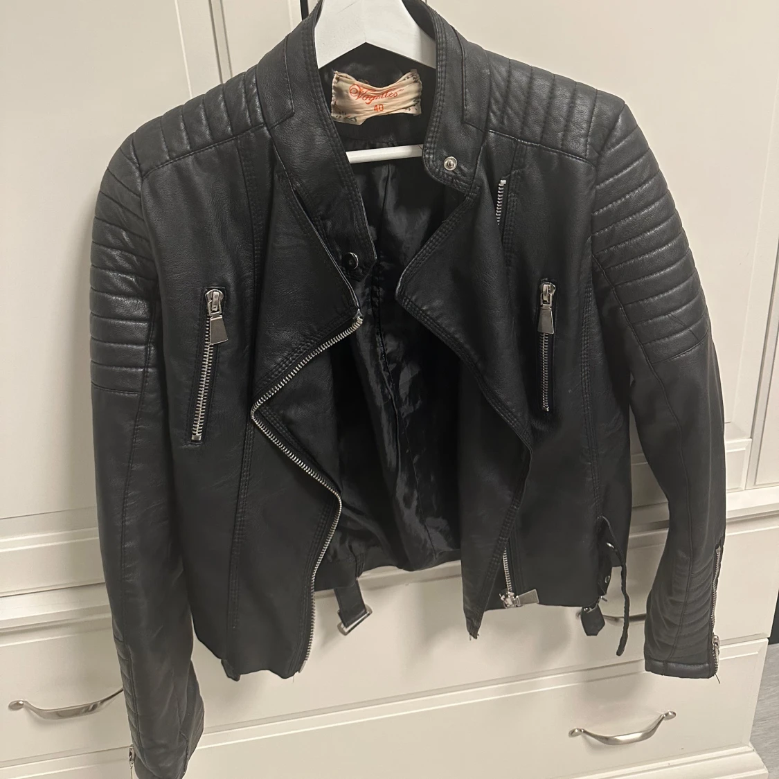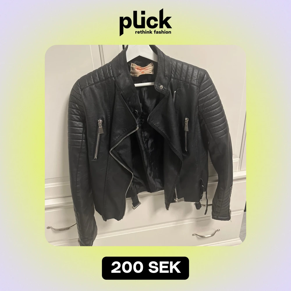 Säljer en snygg svart skinnjacka i mycket bra skick. Jackan har coola dragkedjedetaljer och quiltade axlar som ger en edgy look. Perfekt för höst och vår, och funkar lika bra till fest som till vardags. Passformen är normal och den har långa ärmar. Ett måste i garderoben för den som gillar rockig stil! Storlek 40, men ganska liten i storleken som motbevisar S