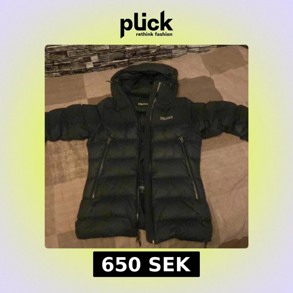 Säljer en svart dunjacka från Marmot i storlek S. Jackan har huva, två snedställda dragkedjefickor och en hög krage. Klassisk pufferstil med breda kanaler och diskret logga på bröstet. Perfekt för kalla dagar och riktigt snygg streetstil.