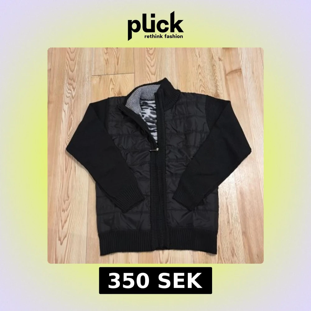 Säljer en svart quiltad jacka med dragkedja och ribbade muddar. Insidan har ett mönstrat foder i grått och svart. Perfekt för kyliga dagar!