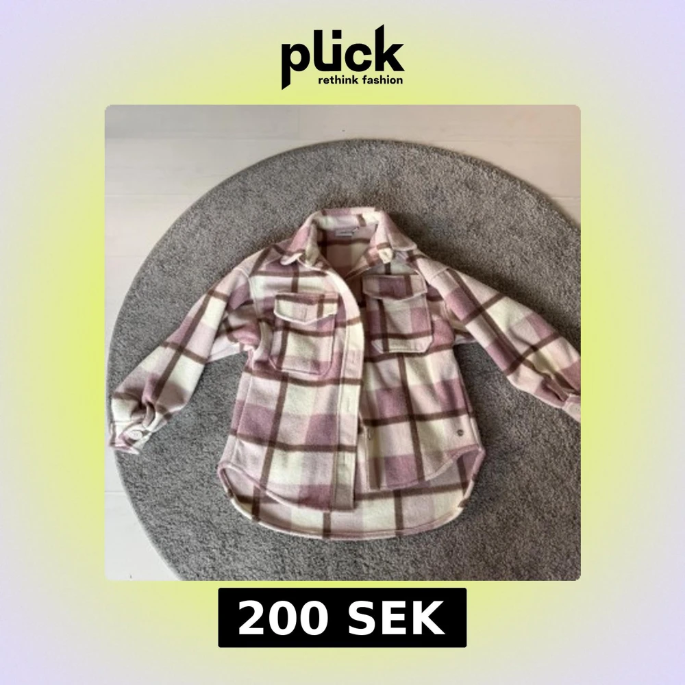 Säljer en mysig kappa från med rutigt mönster i ljusrosa, beige och vitt. Kappan har två stora bröstfickor med lock, klassisk krage och knappar framtill. Perfekt för lager-på-lager och chill stil.